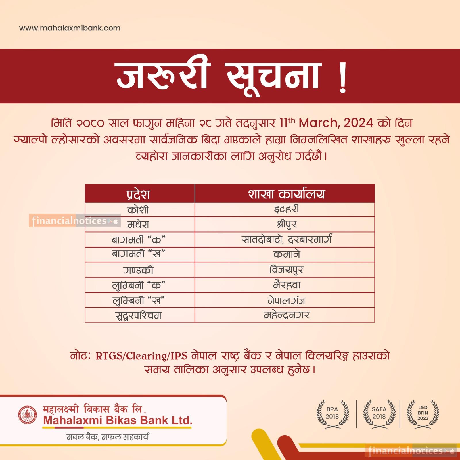महालक्ष्मी विकास बैंकको जरूरी सूचना