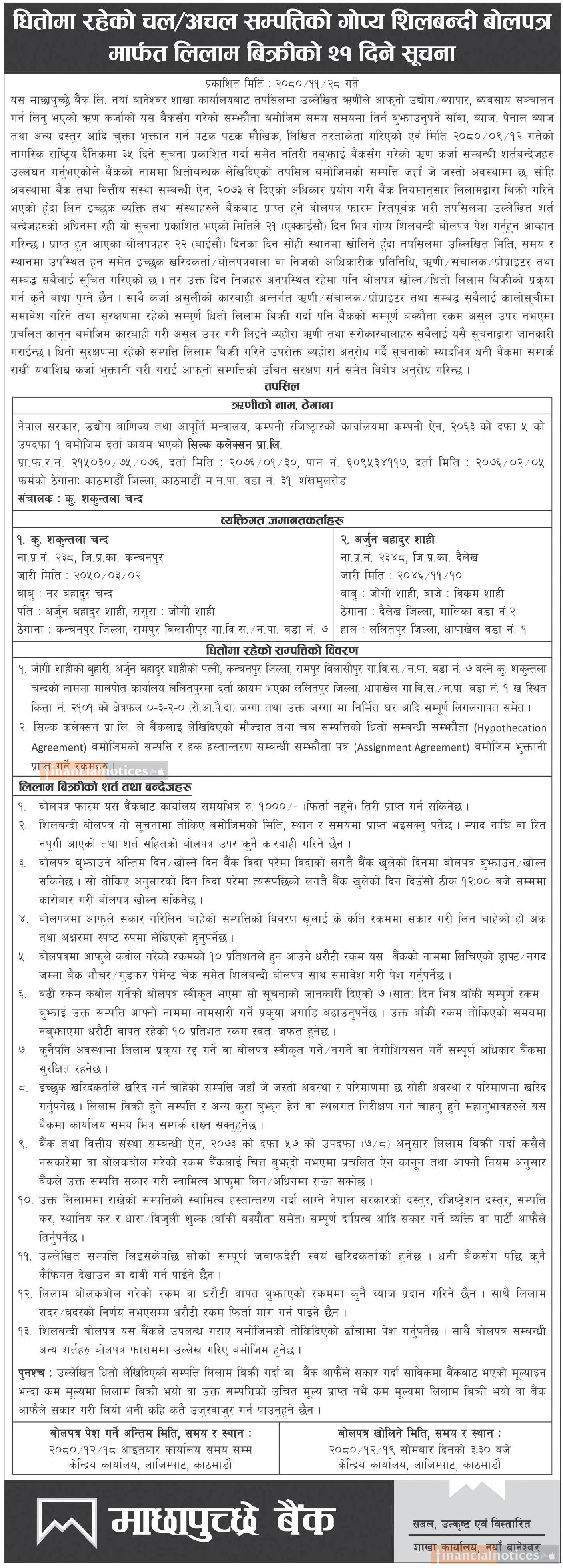 माछापुच्छ्रे बैंकको धितो रहेको चल /अचल सम्पत्ति लिलाम बिक्रीको २१ दिने सूचना