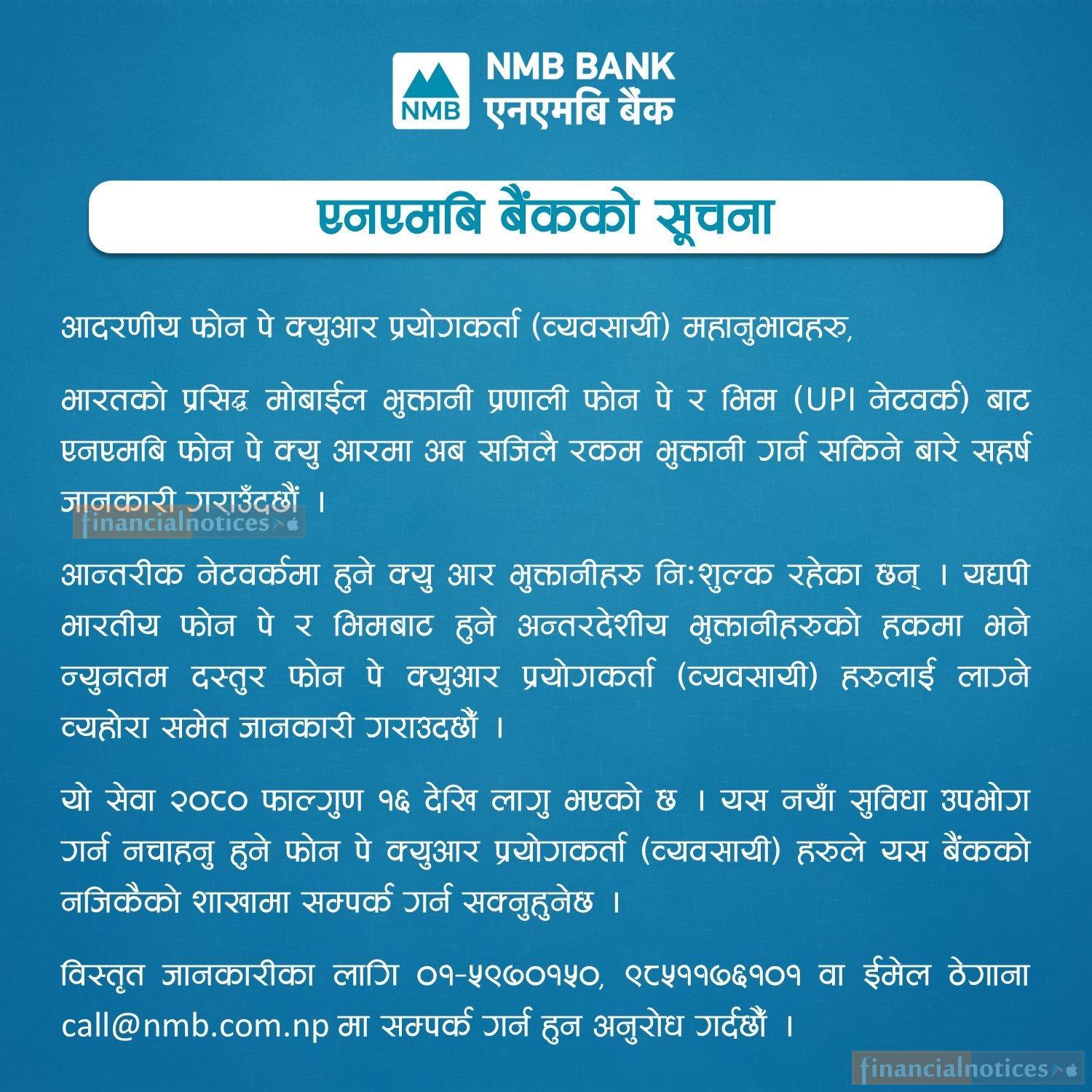 एनएमबि बैैंकको अन्तरदेशीय कारोबार (व्यावसायिक भुक्तानी) सम्बन्धी सूचना