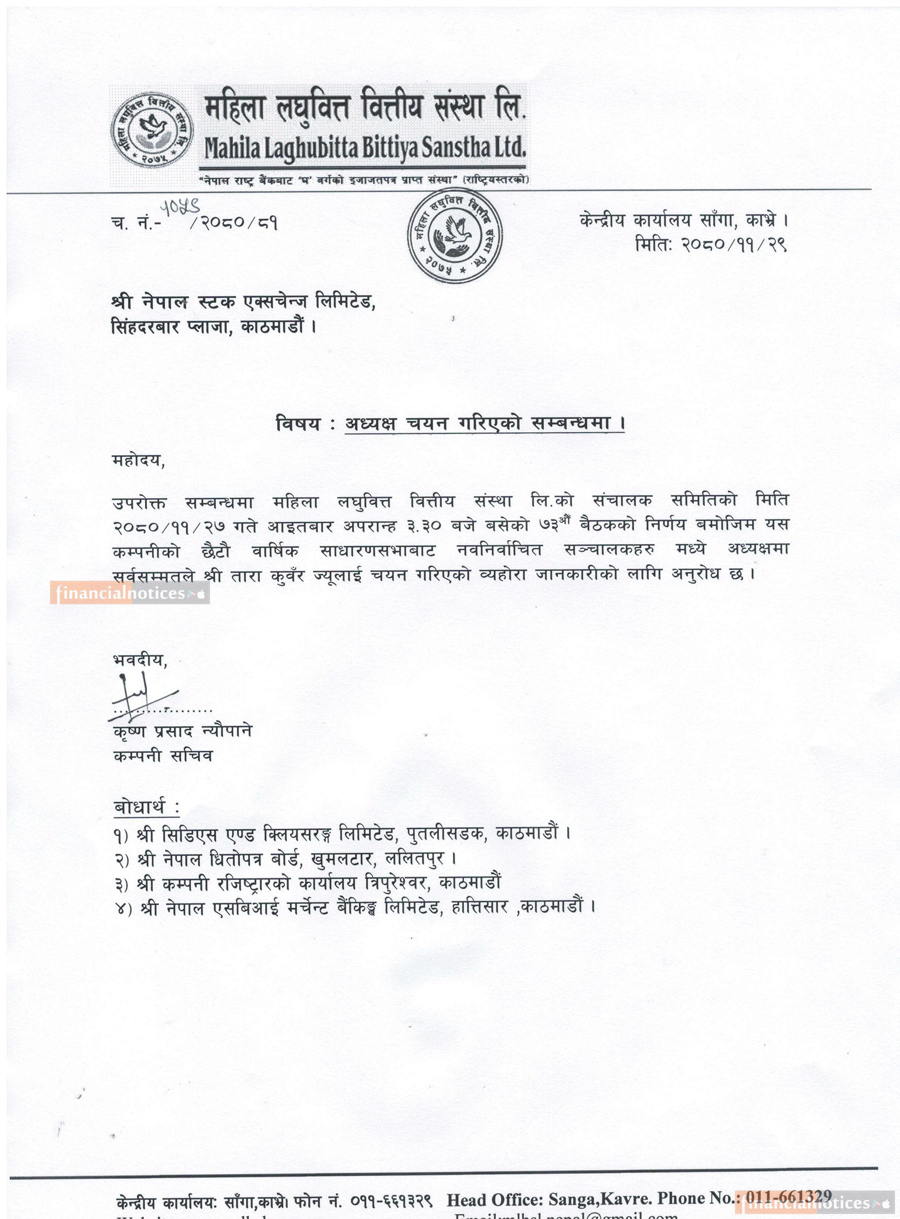 महिला लघुवित्तको अध्यक्षमा तारा कुवँर चयन भएको सम्बन्धी सूचना
