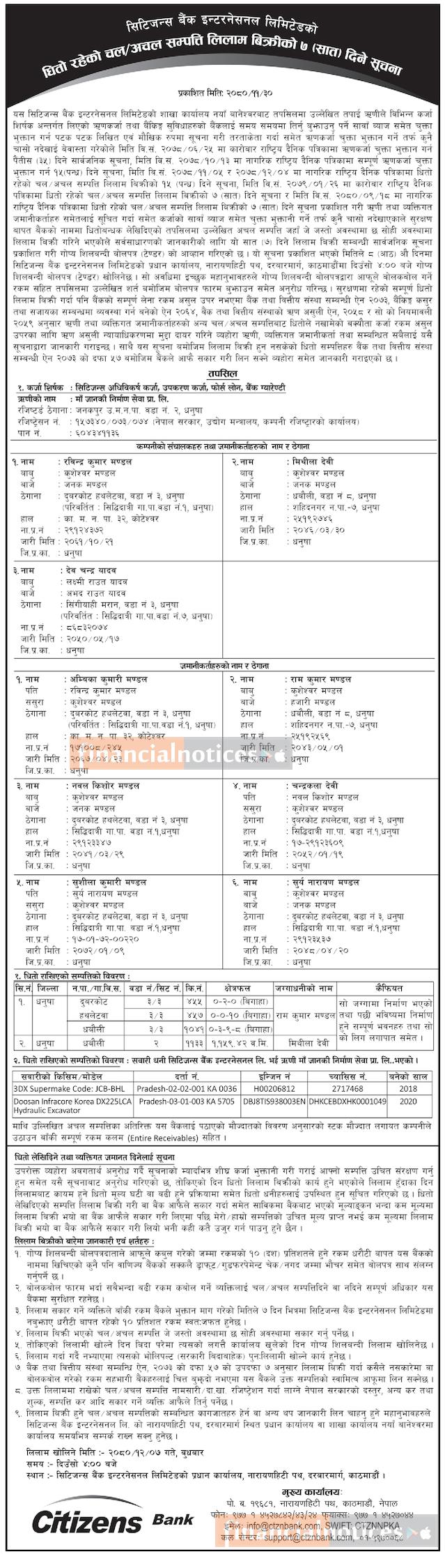 सिटिजन्स बैंकको धितो रहेको चल अचल सम्पत्तिको लिलाम बिक्रीको ७ दिने सूचना