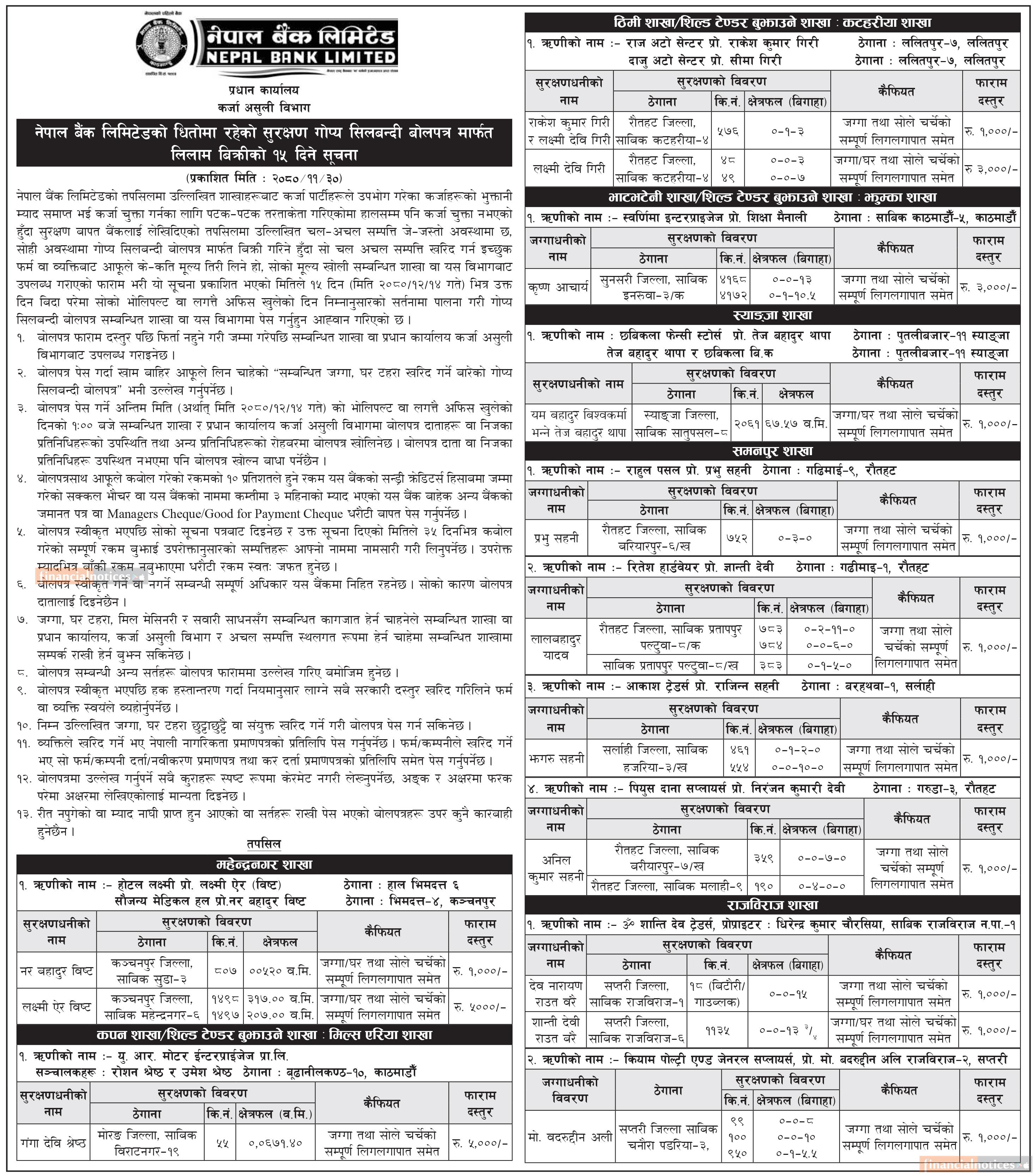 नेपाल बैंकको धितो सुरक्षण गोप्य शिलबन्दी बोलपत्र मार्फत लिलाम बिक्रीको सूचना