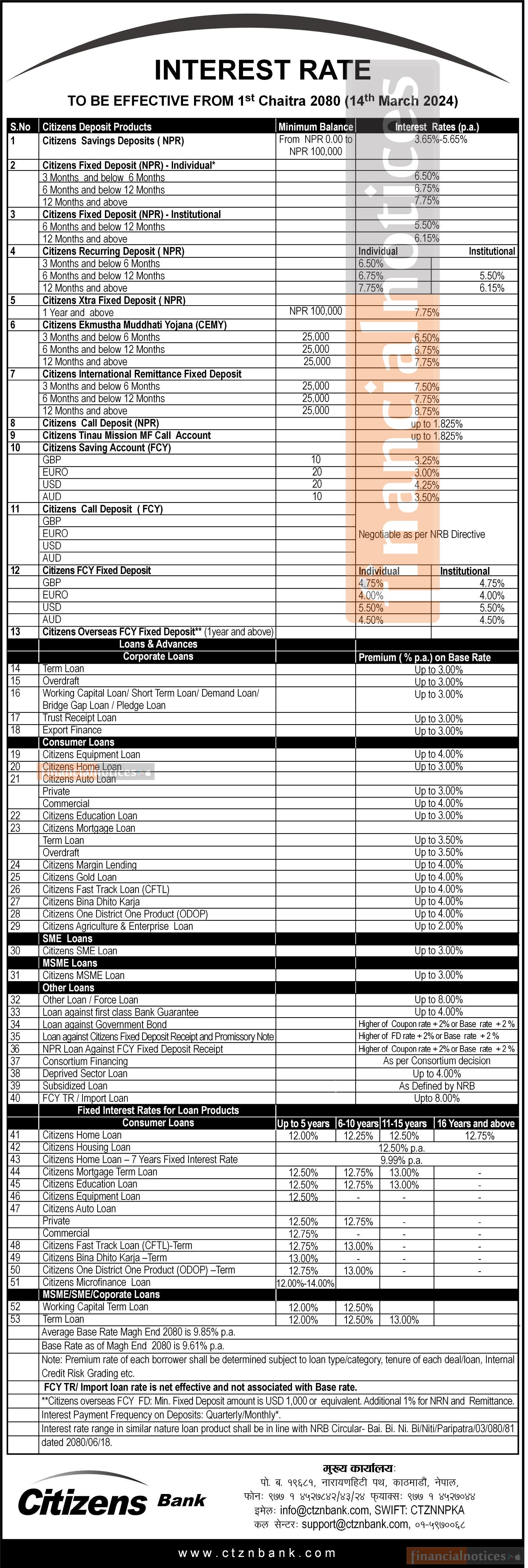सिटिजन्स बैंकको चैत्रदेखि लागुहुने नयाँ ब्याजदर सार्वजानिक, कुन खातामा कति पुग्यो ?