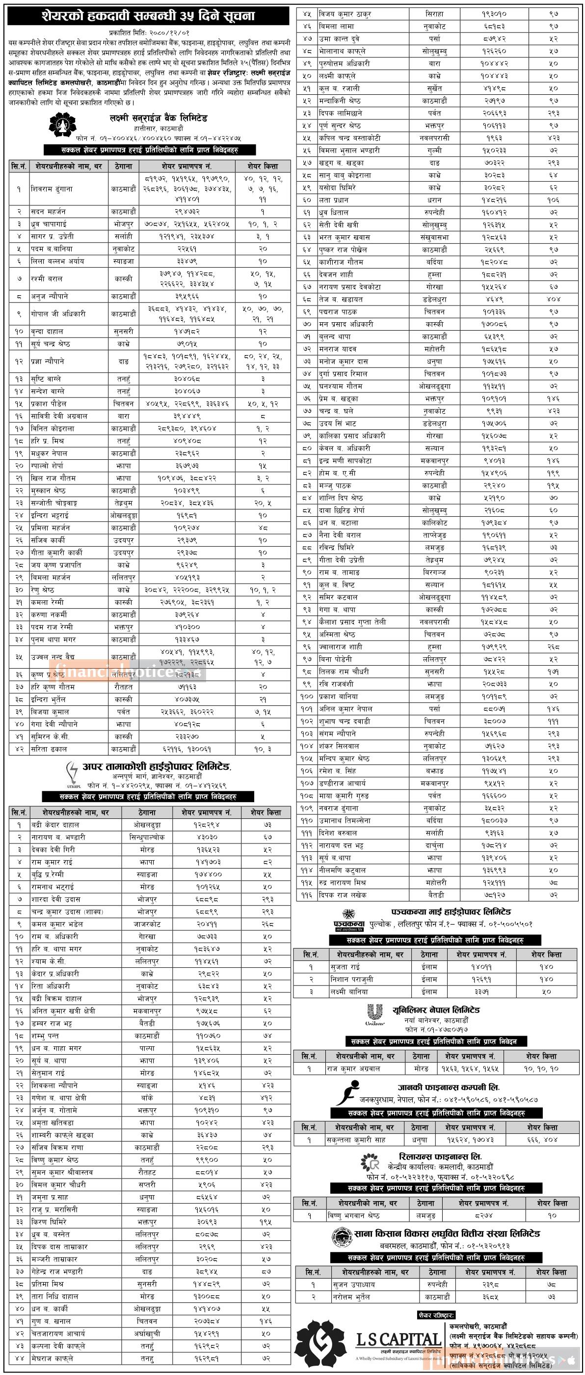 शेयरको हकदावी सम्बन्धी ३५ दिने सूचना