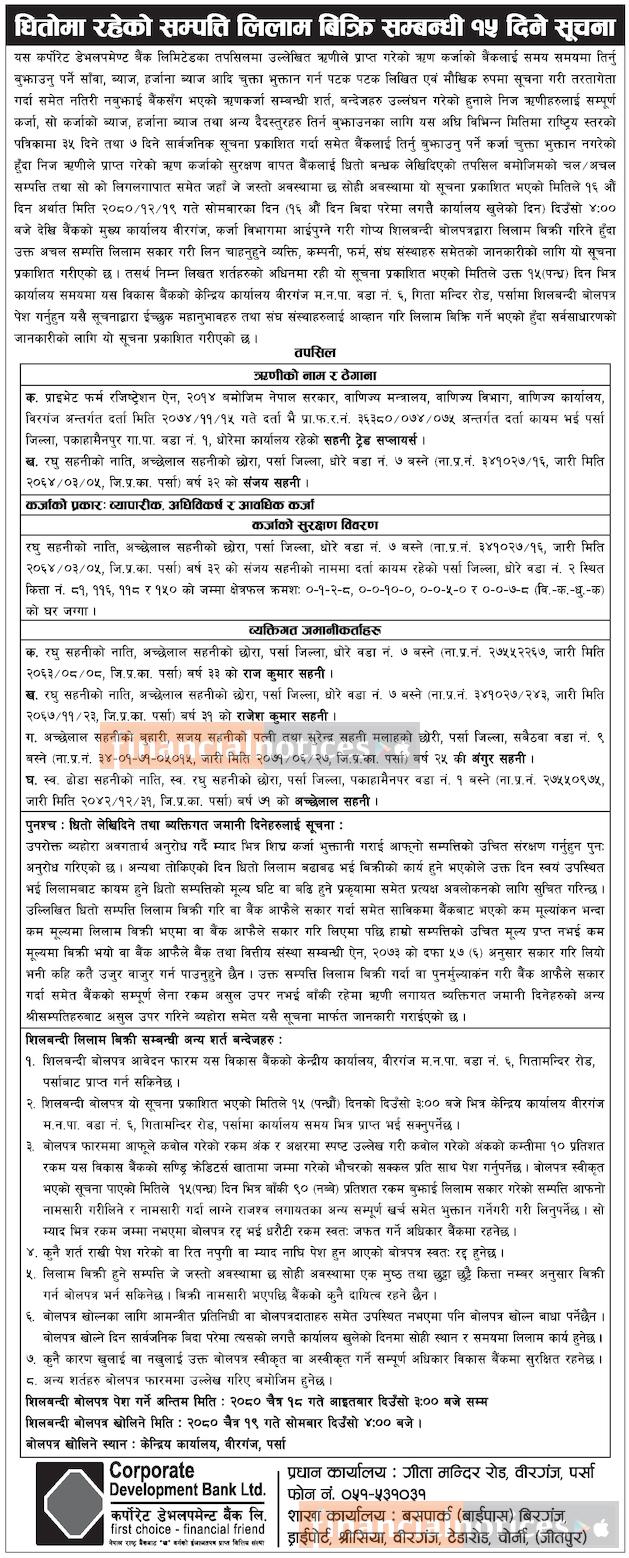 धितोमा लिलाम बिक्री सम्बन्धी १५ दिने सूचना