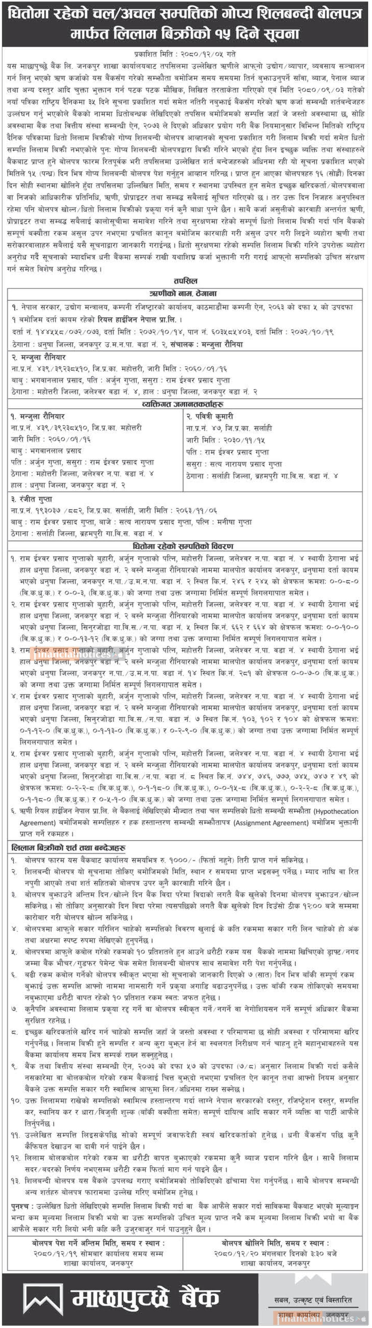 धितोमा रहेको चल अचल सम्पत्तिको गोप्य शिलबन्दी बोलपत्र मार्फत लिलाम बिक्रीको १५ दिने सूचना