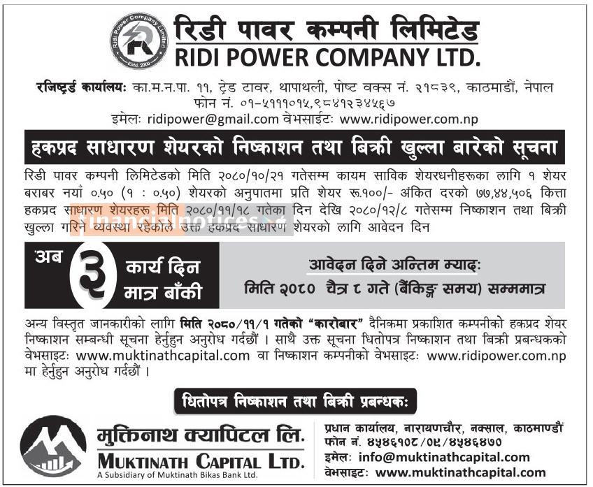 रिडी पावरको हकप्रद साधारण शेयरको बिक्री खुल्ला बारेको सूचना -