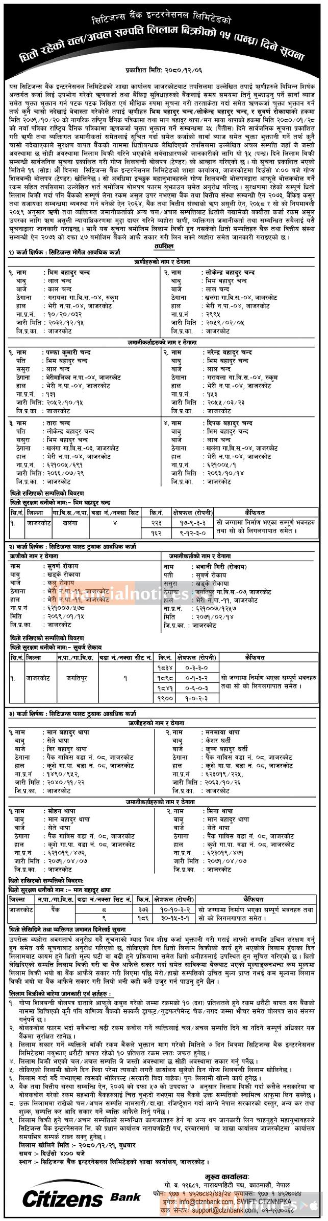 ऋणीको धितो रहेको चल अचल सम्पत्ति लिलाम बिक्री गर्दै सिटिजन्स बैंक -
