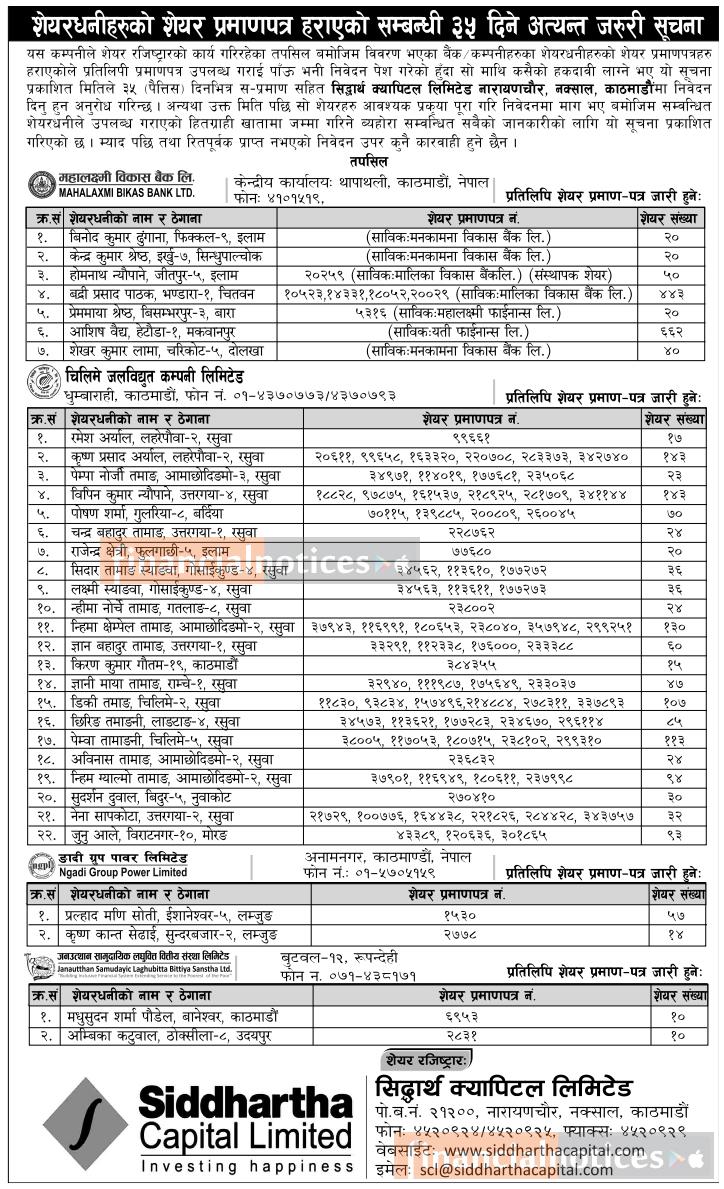 शेयरधनीहरुको शेयरप्रमाणत्र हराएको सम्बन्धी सूचना