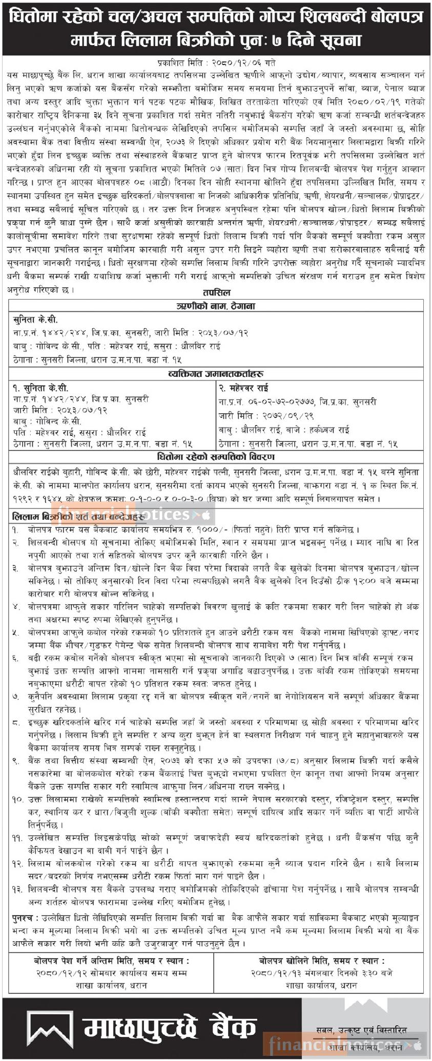 Kumari Bank Auction Notice for Non-Banking Assets at Mahendranagar, Kanchanpur -