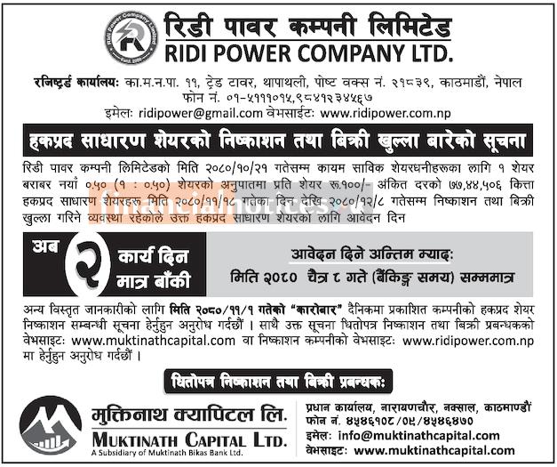 रिडि पावरको हकप्रद शेयरको निष्काशन तथा बिक्री खुल्ला बारेको सूचना