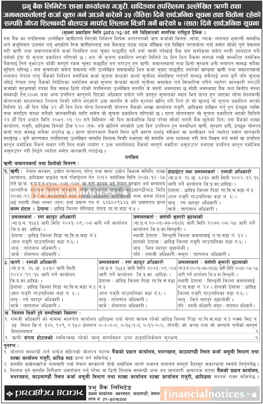 उल्लेखित ऋणीहरुलाई कर्जा चुक्ता गर्न आउने तथा धितोमा रहेको अचल सम्पत्तिहरु बिक्रीको सूचना