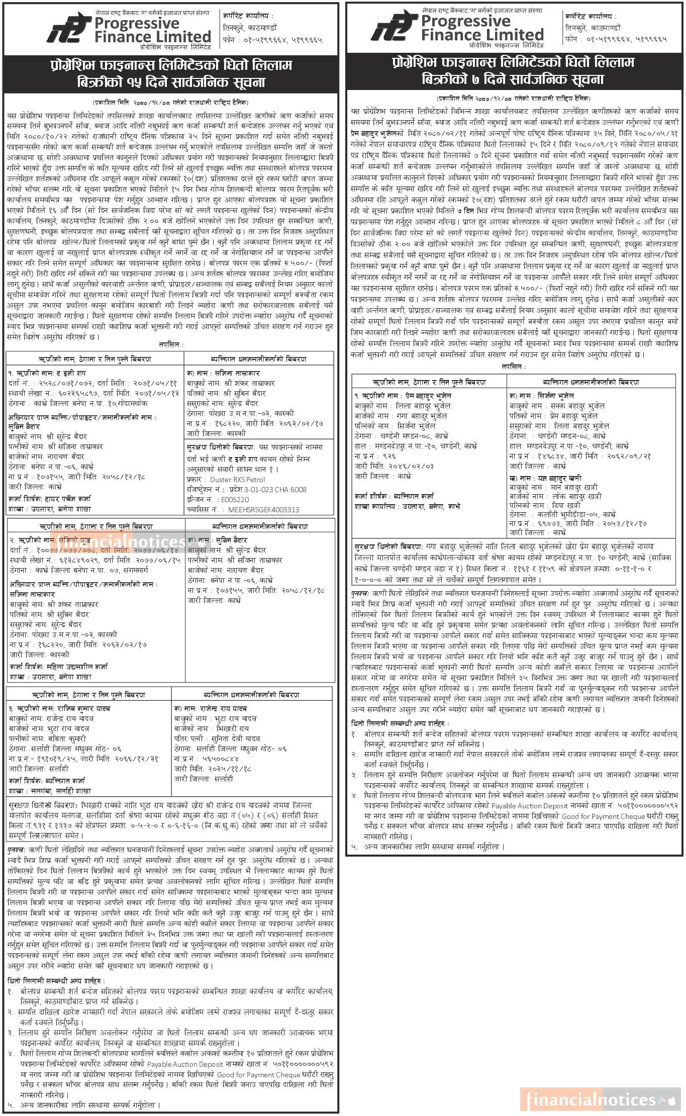 प्रोगेशिभ फाइनान्सको धितो लिलाम बिक्रीको ७ र १५ दिने सार्वजानिक सूचना