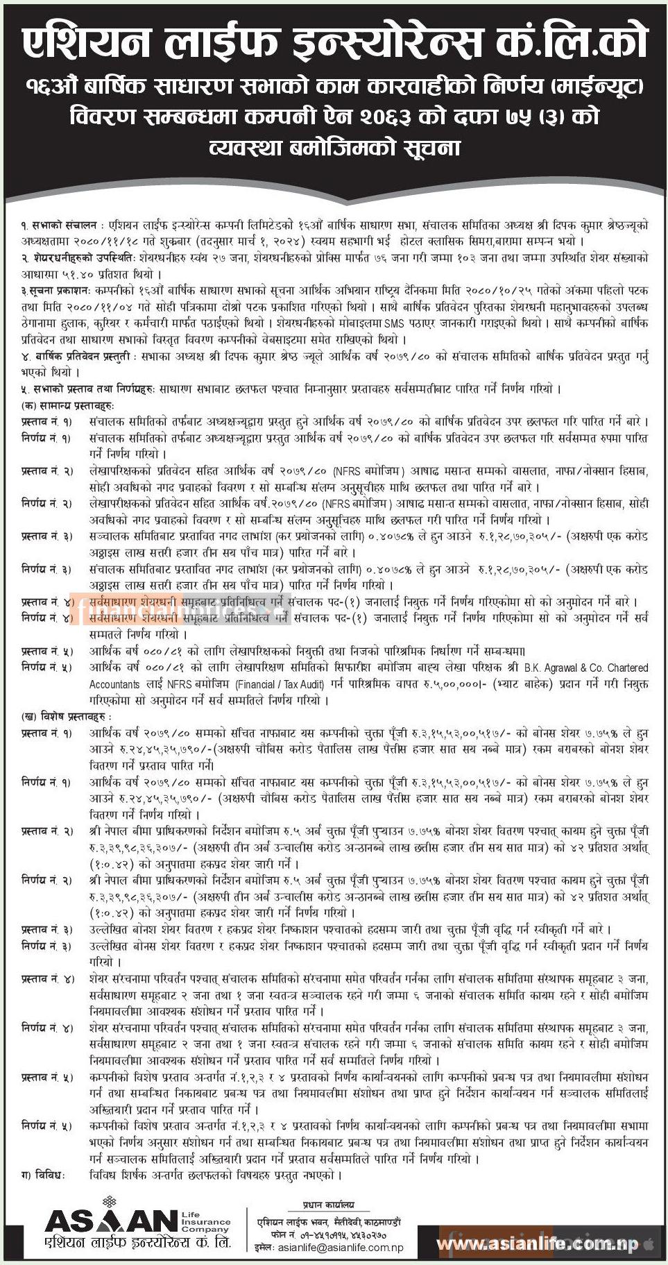 Asian Life Insurance Company Limited has published the minutes of its 16th AGM.