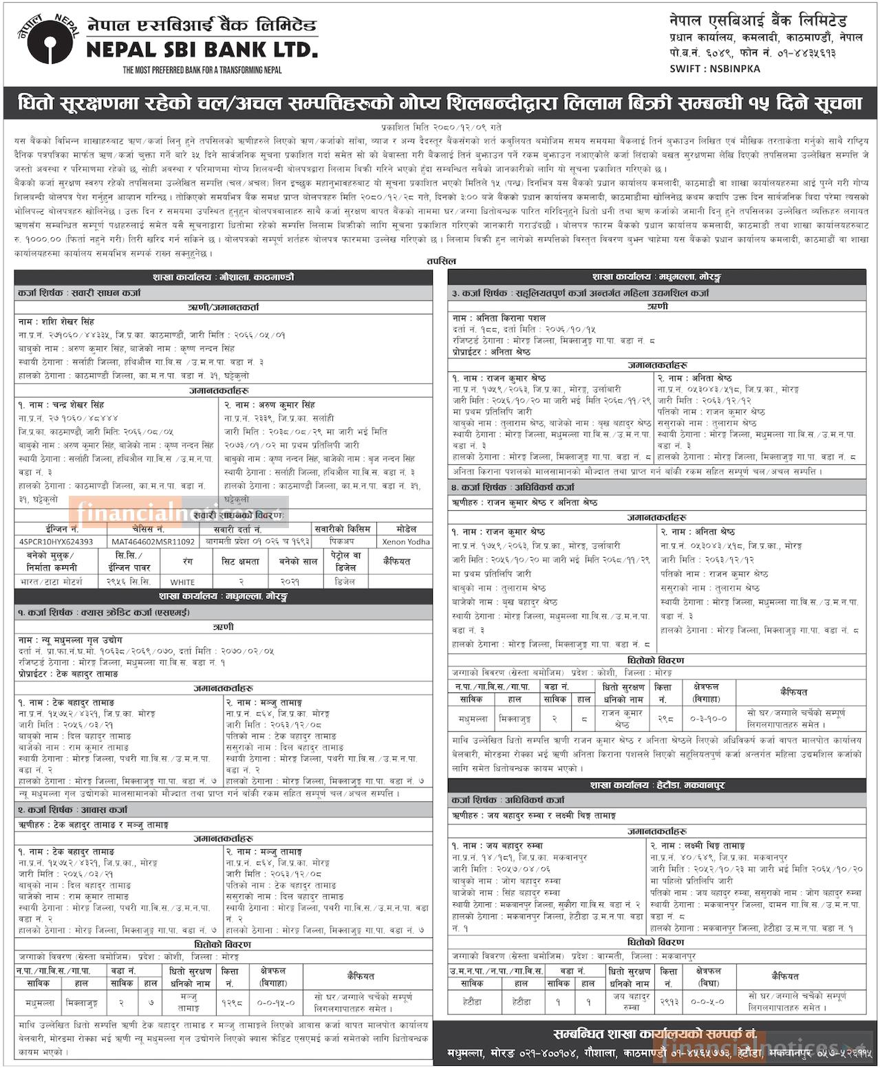 Nepal SBI Bank: Auction Notice for Non-Banking Assets at Geta-2, Kailali