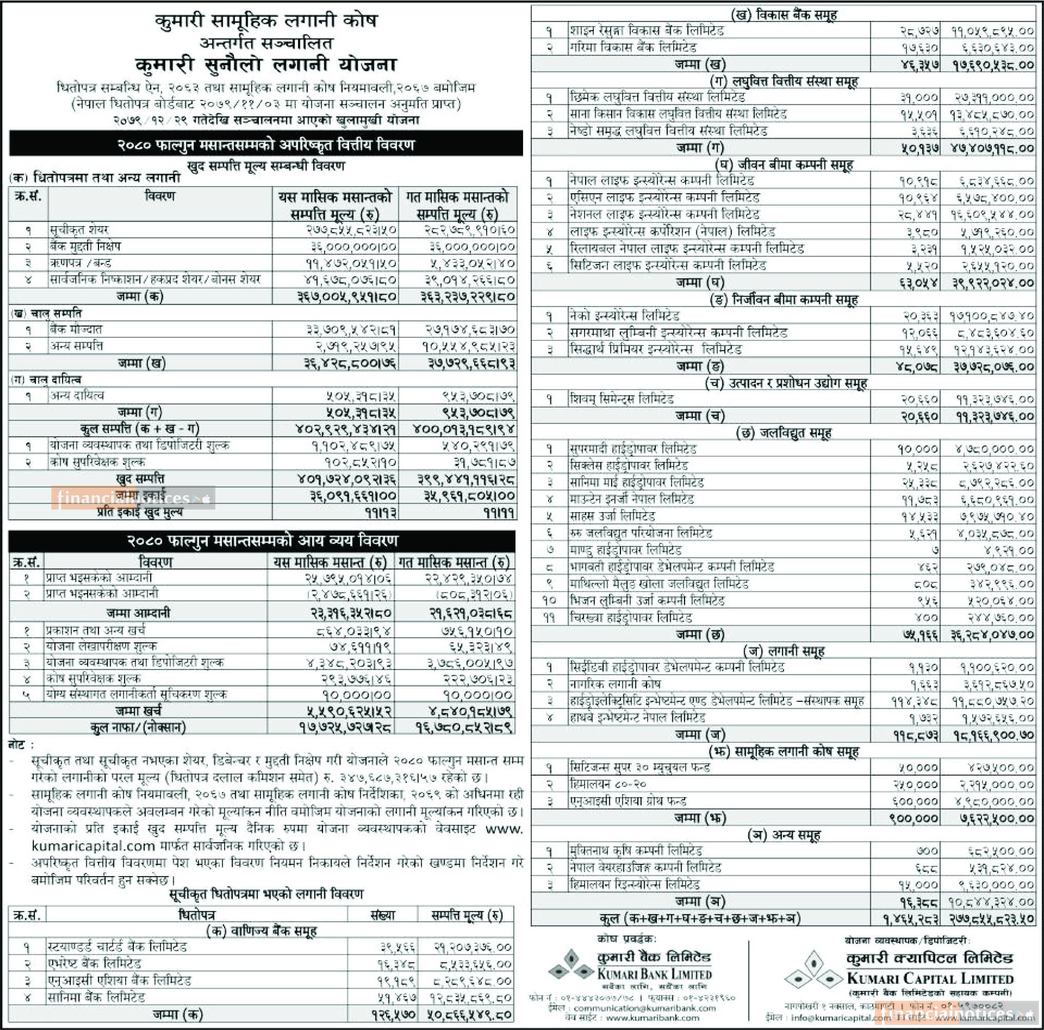 Kumari Capital Limited Announces the Net Asset Value (NAV) of 'Kumari Sunaulo Lagani Yojana' for the Period Ending Falgun, 2080.