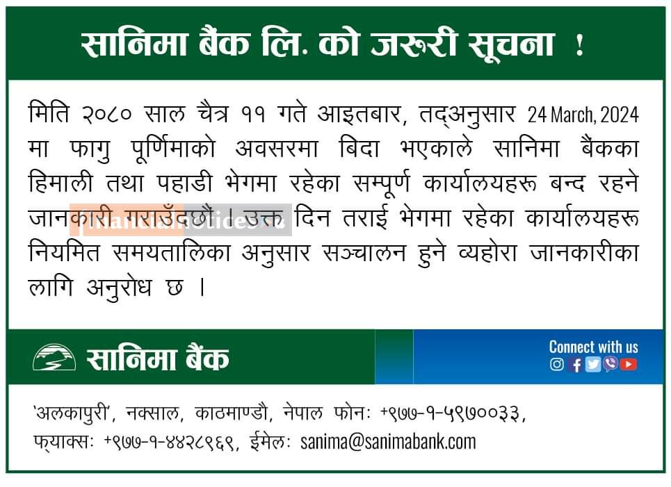 सानिमा बैंकको जरुरी सूचना -