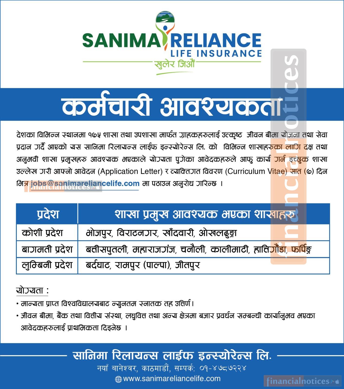 Sanima Reliance Life Insurance Limited, a dynamic newcomer in Nepal's thriving life insurance market, is on the lookout for talented individuals eager to forge a rewarding career in the insurance sector. We are currently seeking candidates for various positions across different locations in Nepal.