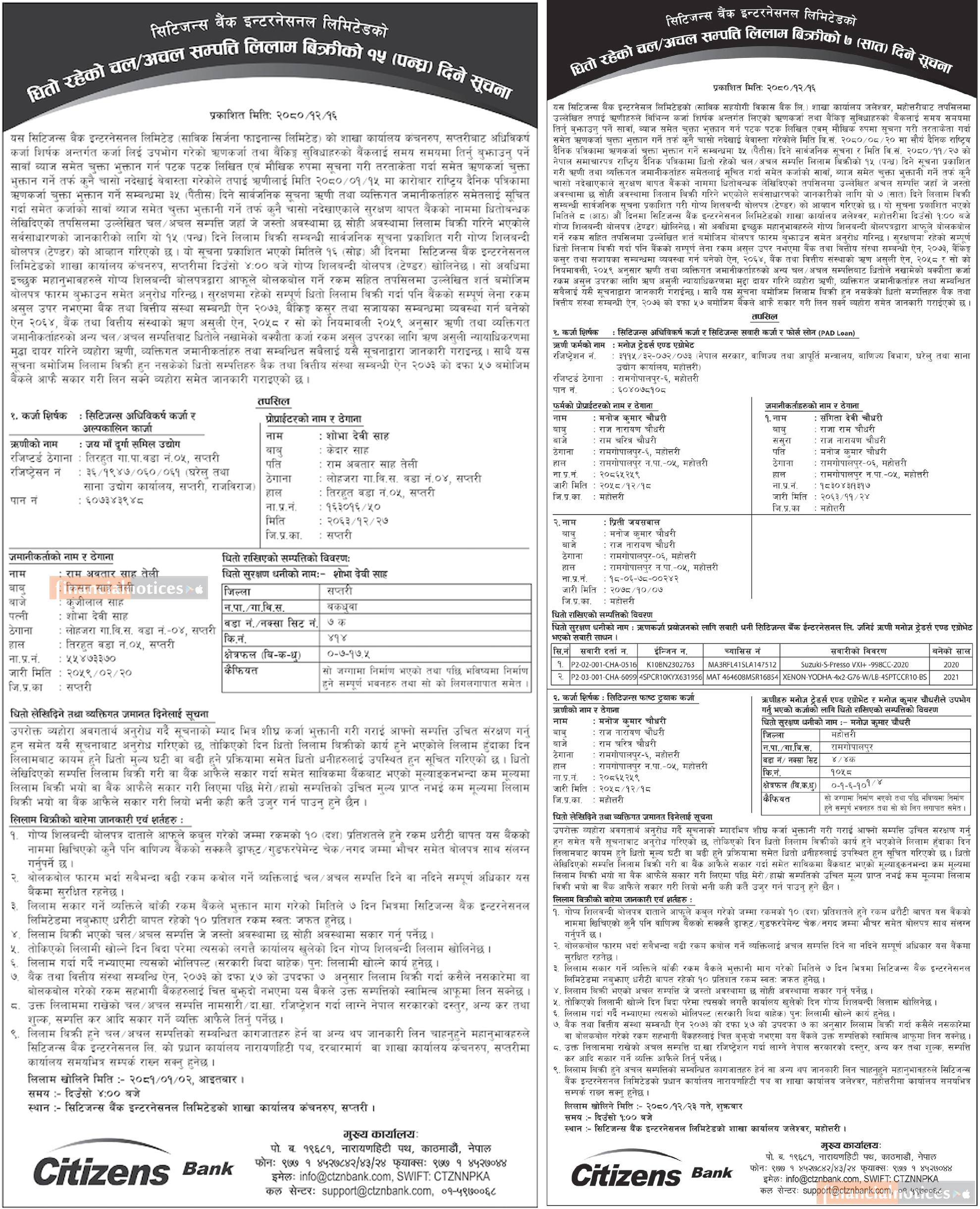 धितोमा रहेको चल अचल सम्पत्तिहरु लिलाम बिक्रीको ७ र १५ दिने सूचना