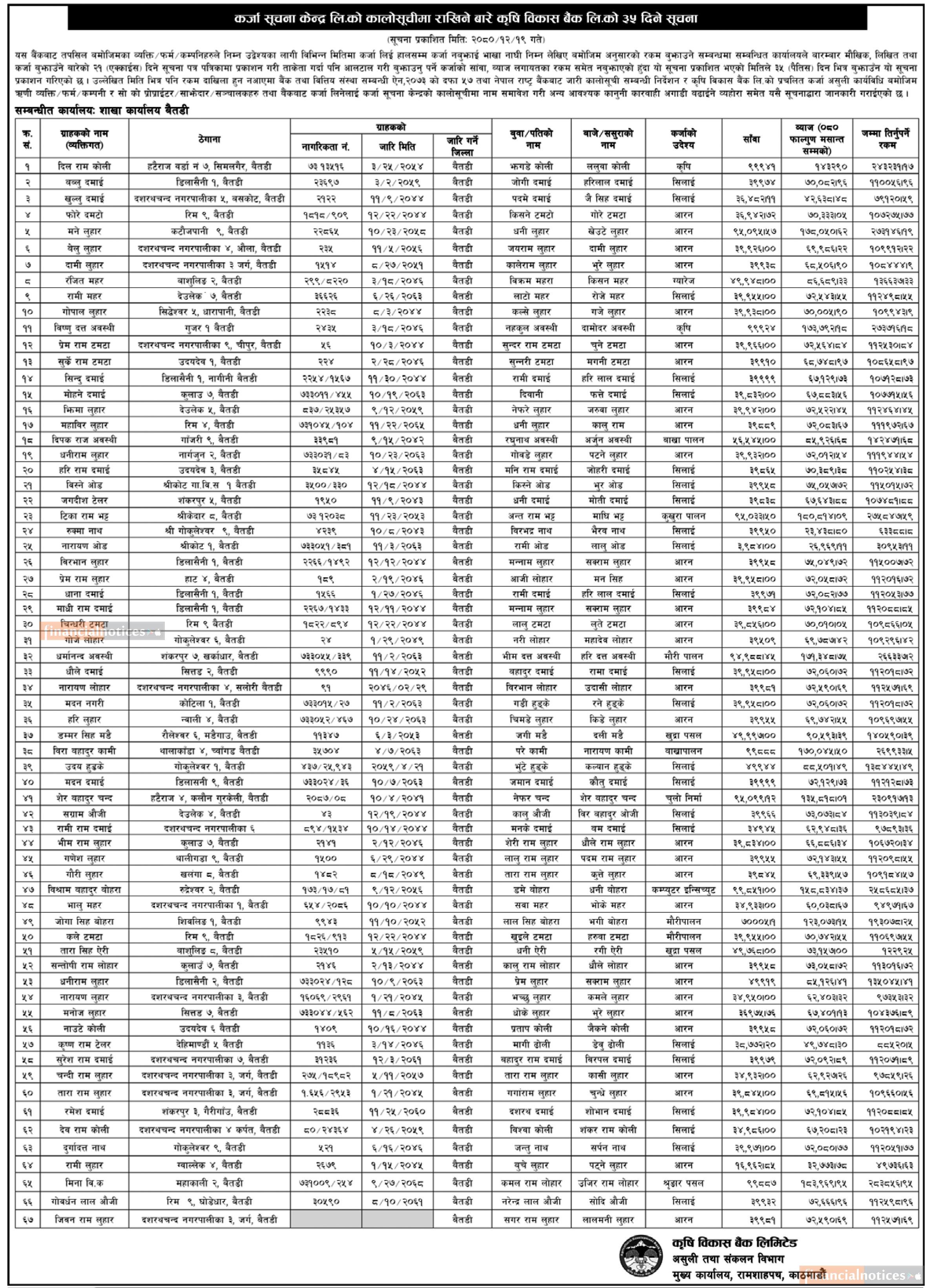 कर्जा भुक्तानी नगर्ने ऋणीलाई कर्जा सूचना केन्द्रको कालोसूचीमा राखिनेबारे कृषि विकास बैंकको सूचना -