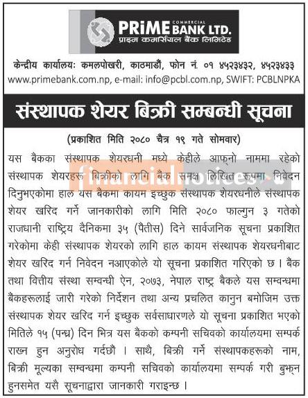 संस्थापक शेयर बिक्री सम्बन्धी ३५ दिने सूचना