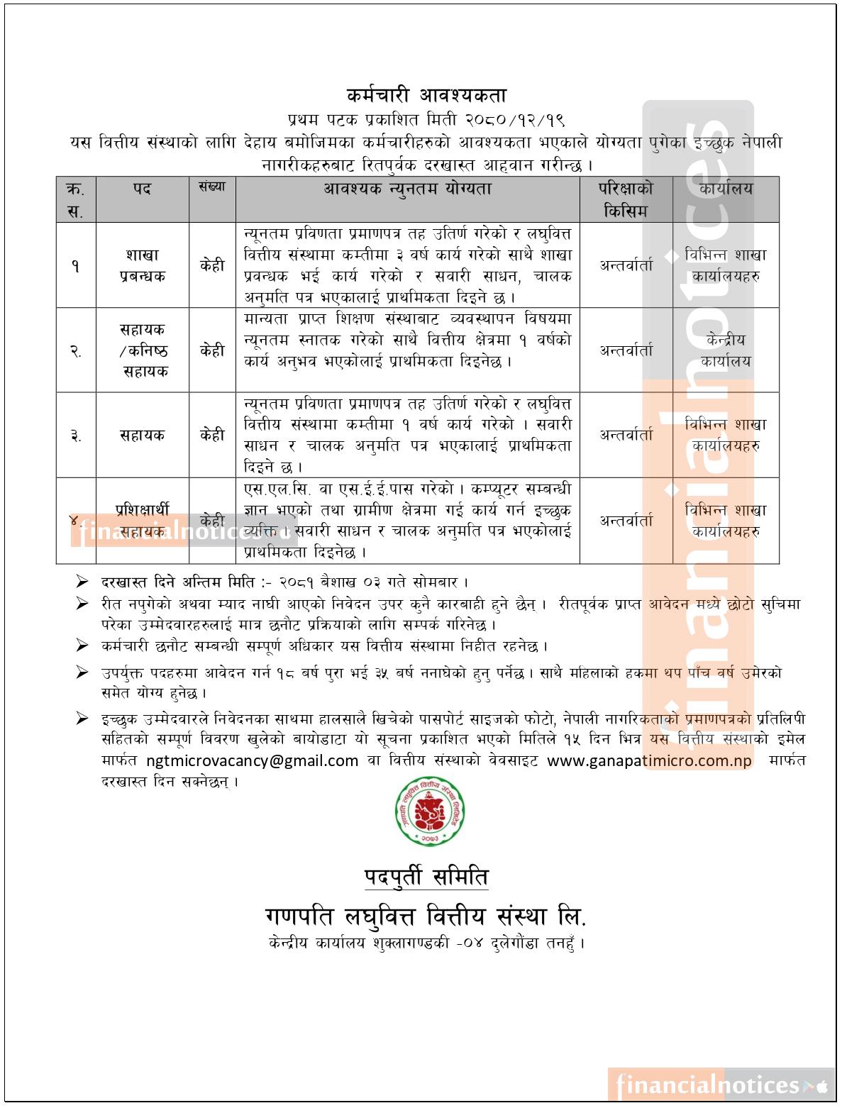 लघुवित्तमा कर्मचारी आवश्यकता - JOB Vacancy -