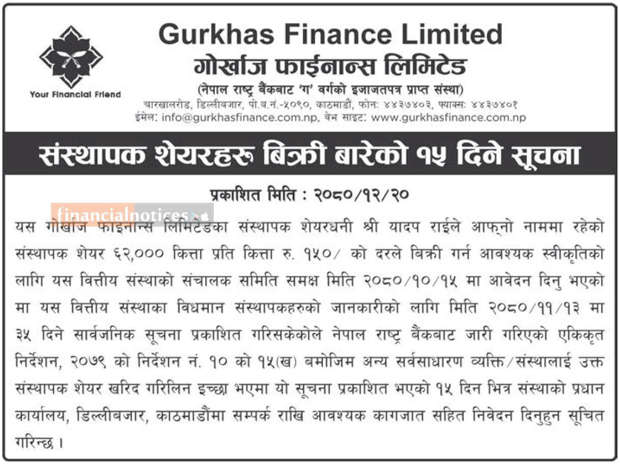 संस्थापक शेयर बिक्री बारेको १५ दिने सूचना