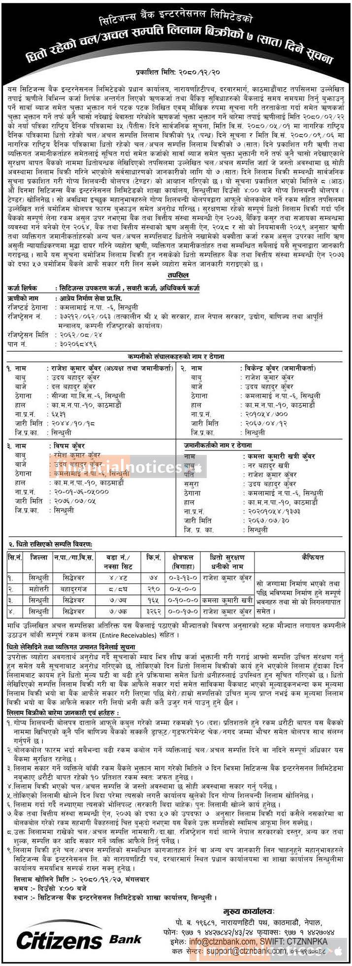धितोमा रहेको चल/अचल सम्पत्ति लिलाम बिक्री गर्न गोप्य शिलबन्दी बोलपत्र आव्हान सम्बन्धी २१ दिने सूचना