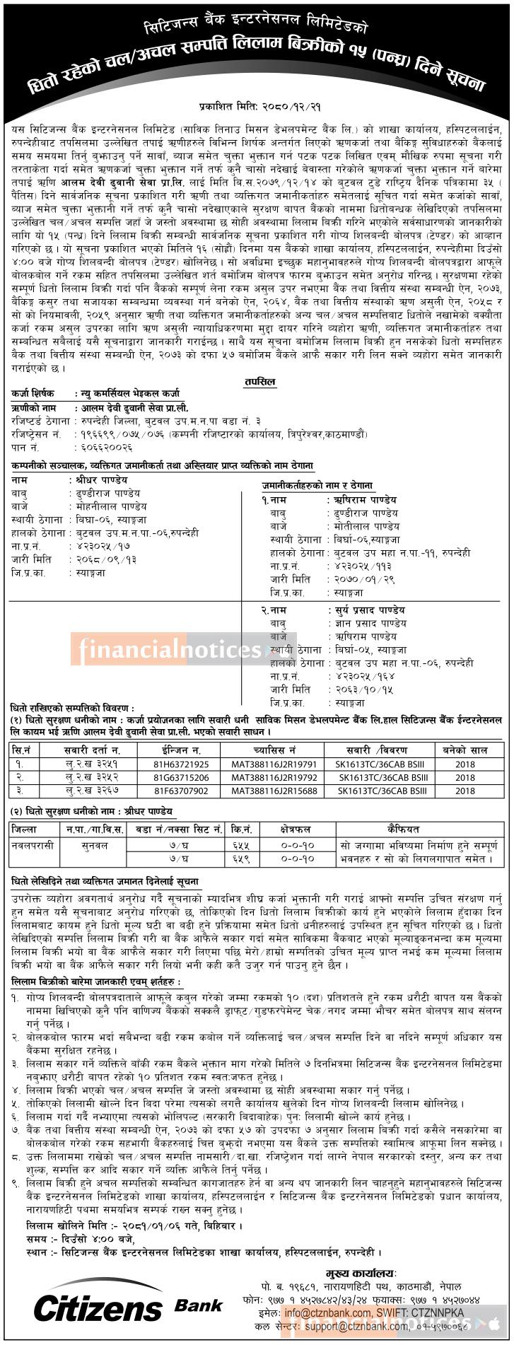 धितोमा रहेको चल अचल सम्पत्तिहरु लिलाम बिक्रीको १५ दिने सूचना