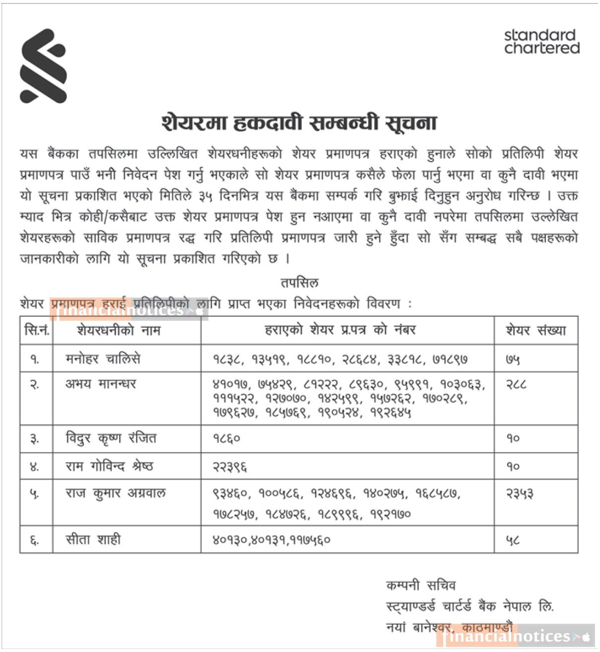 शेयरमा हकदावी सम्बन्धी सूचना