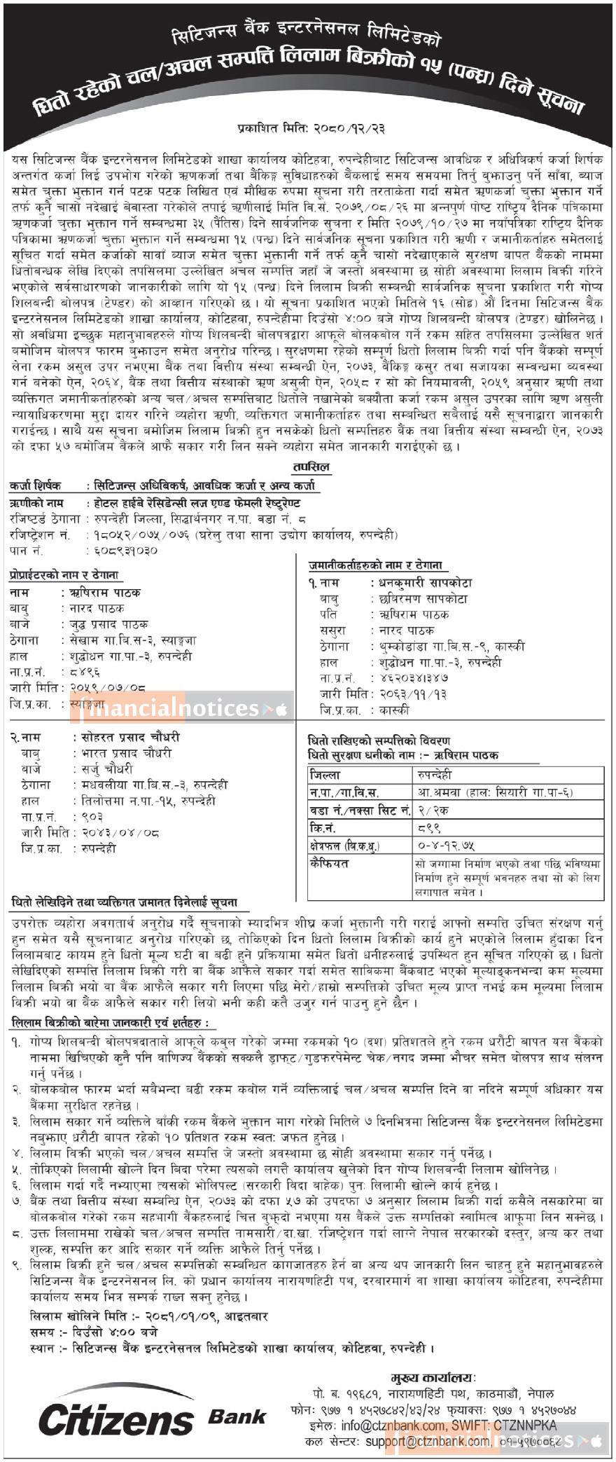 Kumari Bank Auction Notice for Non-Banking Assets at Mahendranagar, Kanchanpur -