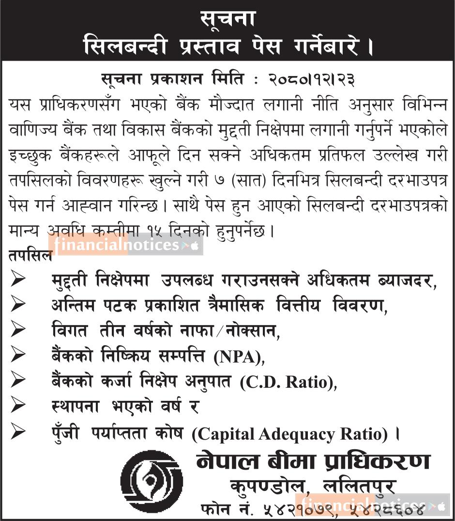 शिलबन्दी प्रस्ताव पेश गर्ने सम्बन्धी नेपाल बीमा प्राधिकरणको जरुरी सूचना