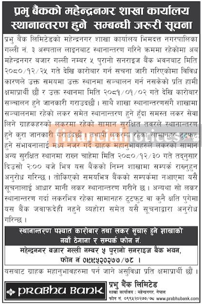 प्रभु बैंकको शाखा कार्यालय स्थानान्तरण हुने सम्बन्धी सूचना