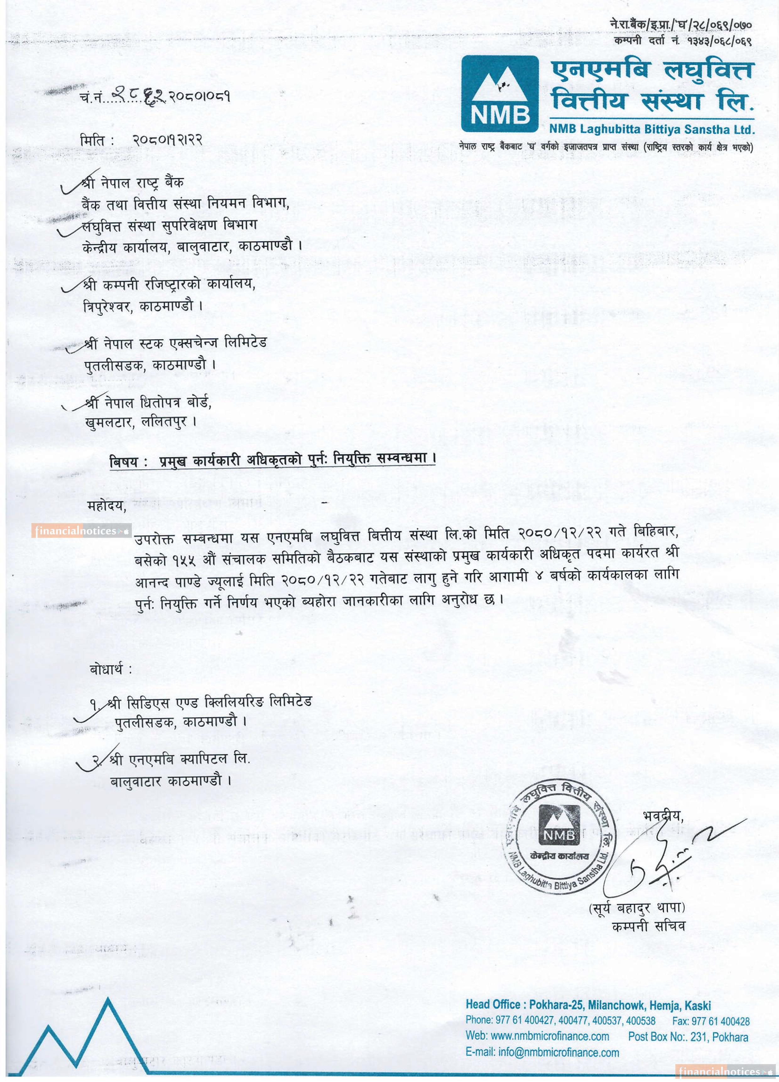 एनएमबि लघुवित्तको सीइओमा आनन्द पाण्डे पुनः नियुक्त बारे सूचना