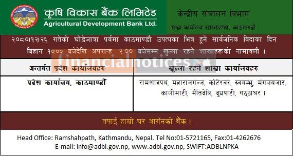भोलि घोडेजात्राका दिन बैंकको शाखा कार्यालयहरू खुल्ला रहने सम्बन्धी सूचना