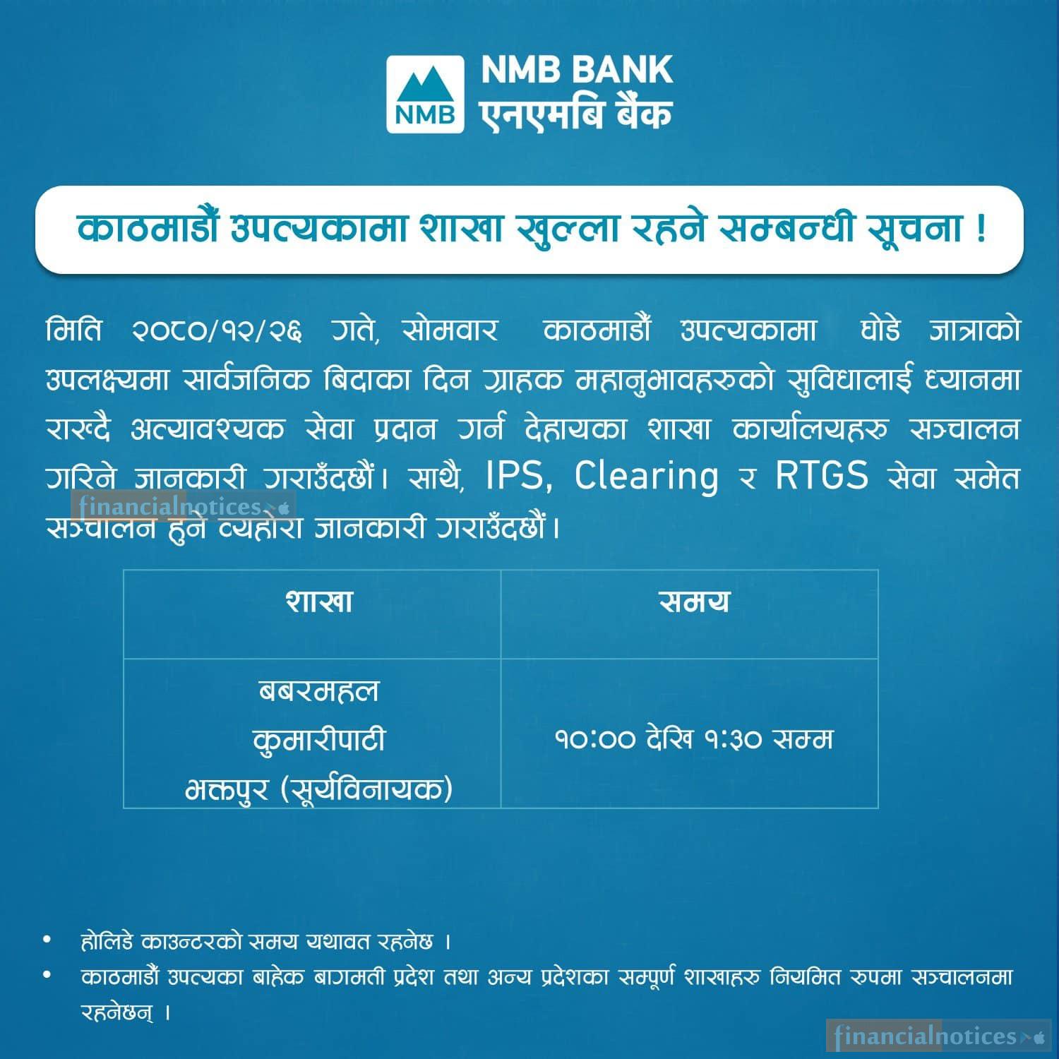 आज एनएमबी बैंकको कुन कुन शाखाहरु खुल्ला रहन्छ ?