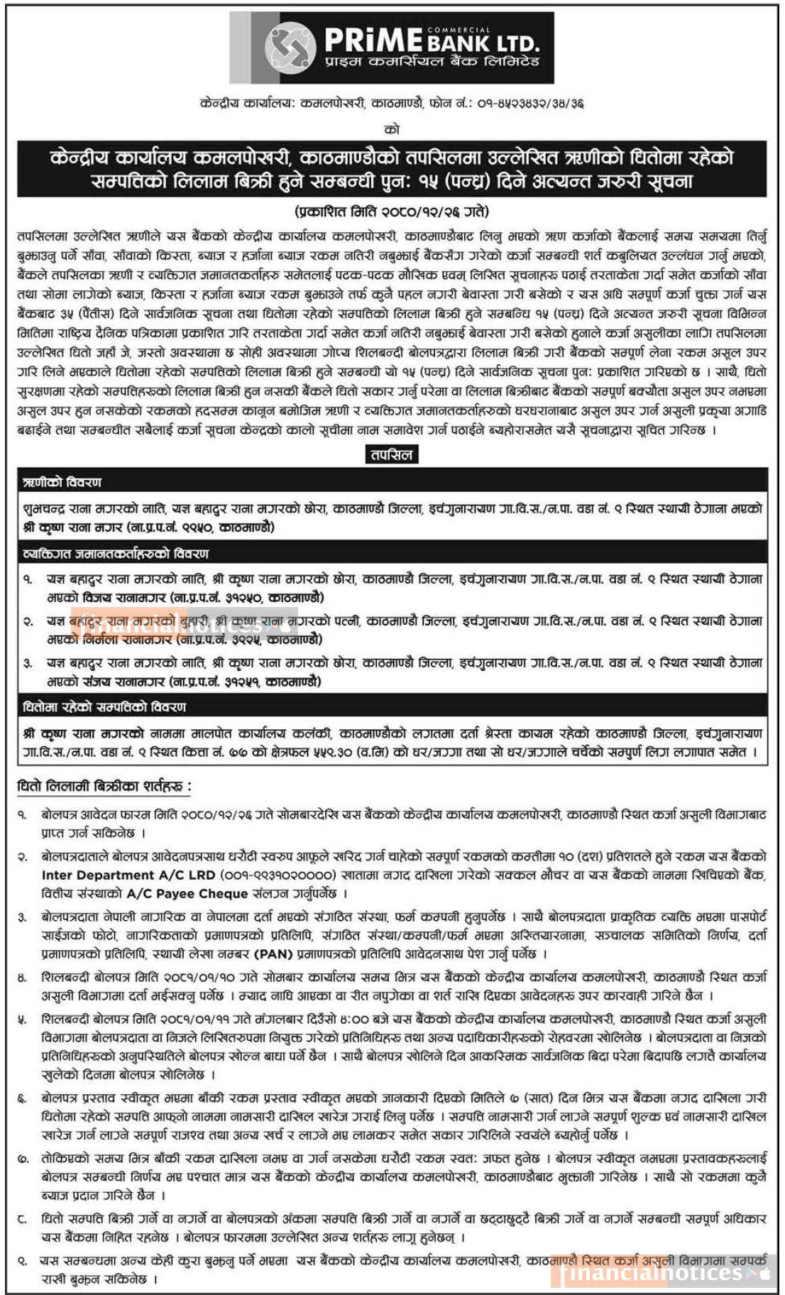 ऋणीको धितोमा रहेको सम्पत्तिको लिलाम बिक्री सम्बन्धी १५ दिने सूचना