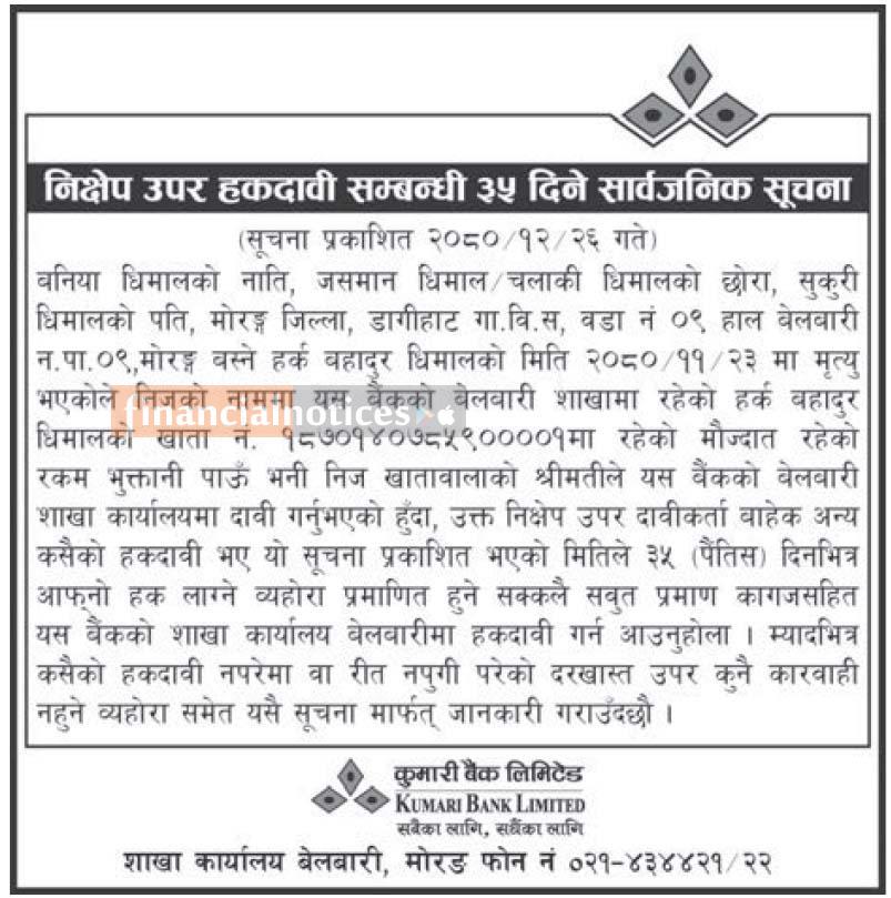 निक्षेप उपर हकदावी सम्बन्धी ३५ दिने सार्वजानिक सूचना