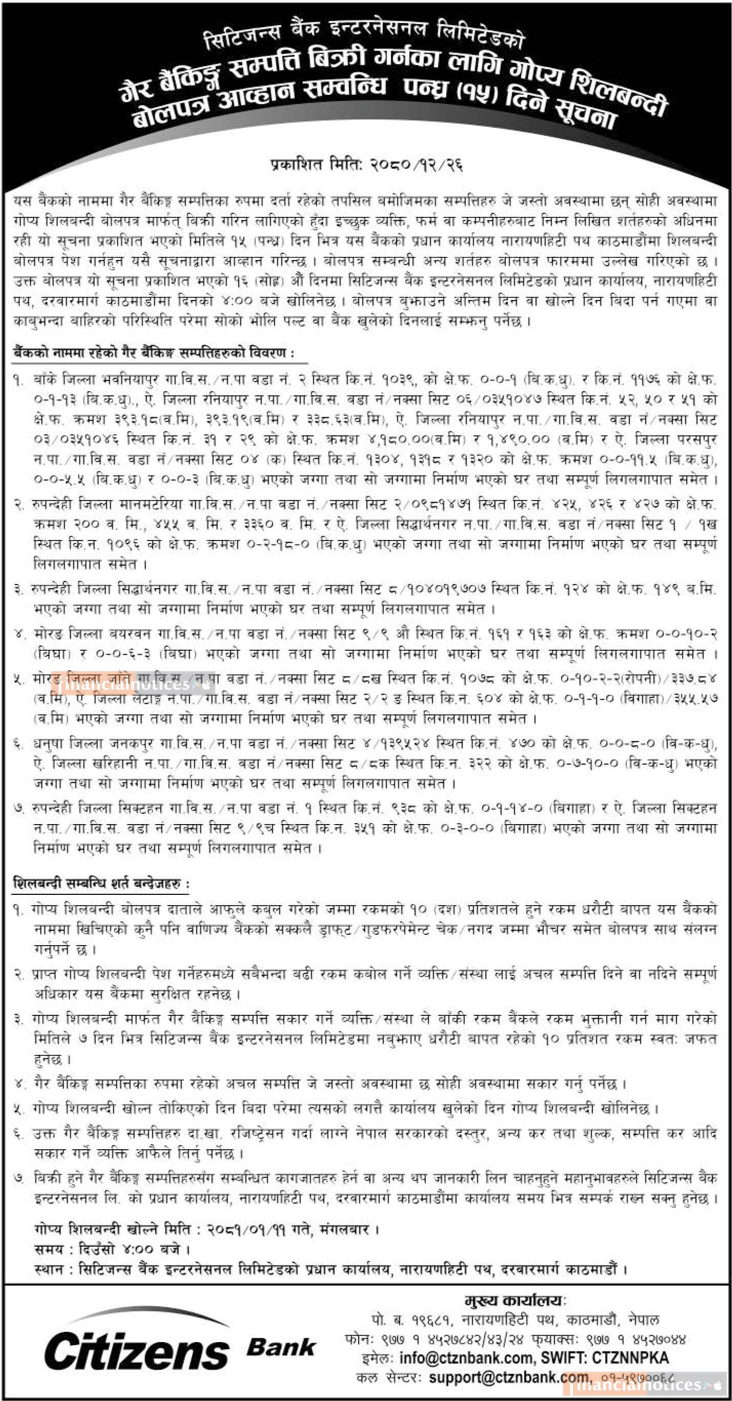 Kumari Bank Auction Notice for Non-Banking Assets at Mahendranagar, Kanchanpur -
