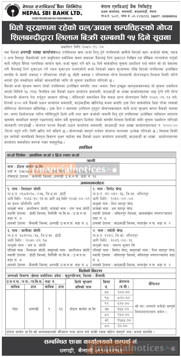 Nepal SBI Bank: Auction Notice for Non-Banking Assets at Geta-2, Kailali