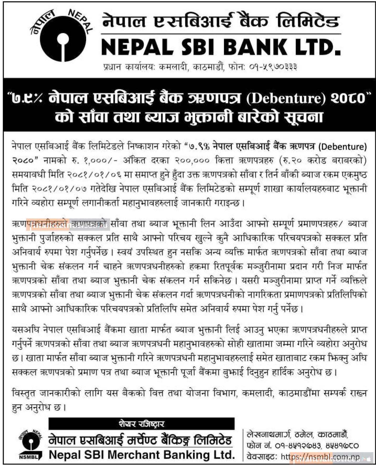 ऋणपत्रको साँवा तथा ब्याज भुक्तानी सम्बन्धी सूचना
