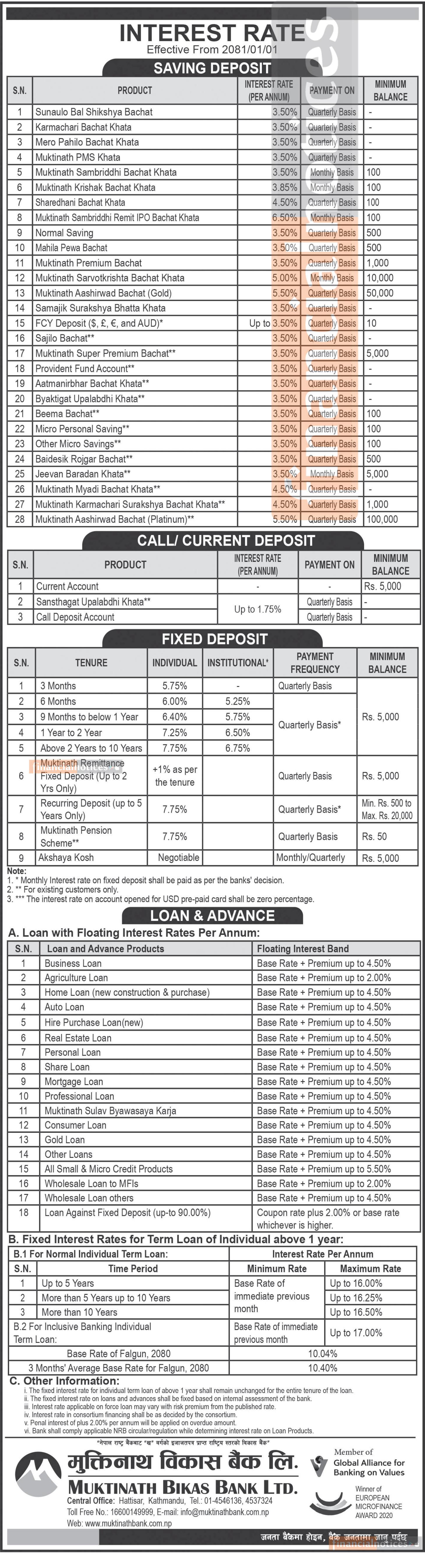 वैशाख १ गतेदेखि मुक्तिनाथ विकास बैंकको नयाँ ब्याजदर लागु, कुन खातामा कति ? -