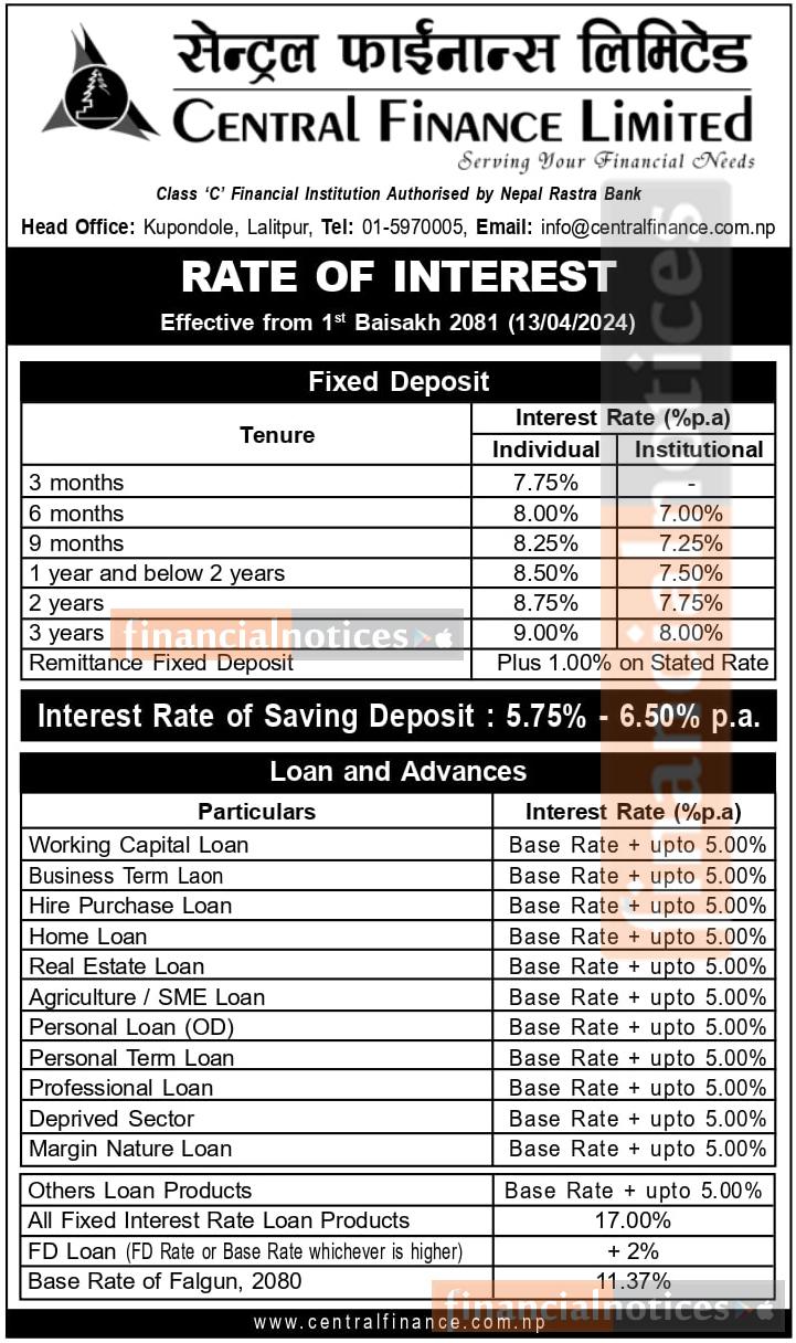 नयाँ वर्षदेखि लागु हुने गरी सेन्ट्रल फाइनान्सको ब्याजदर सार्वजनिक, कुन खातामा कति ?