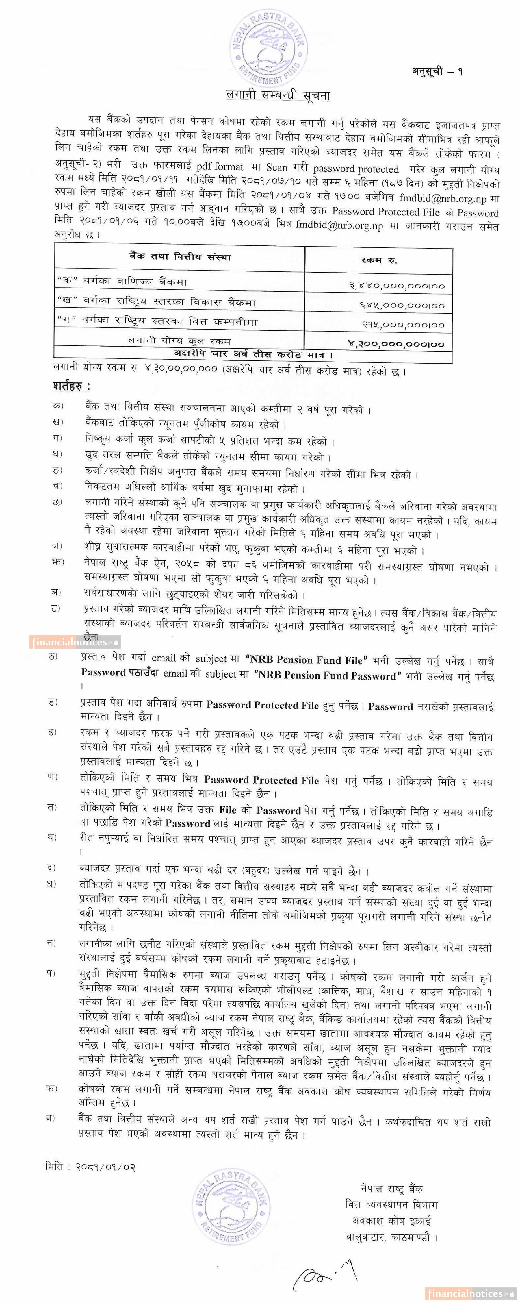 नेपाल राष्ट्र बैंकले मुद्दति निक्षेपमा ४ अर्ब ३० करोड रुपैयाँ लगानी गर्ने बारे सूचना