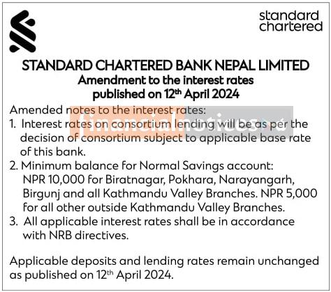 स्ट्याण्डर्ड चार्टर्ड बैंकको नयाँ ब्याजदर संशोधन गरिएको सम्बन्धी सूचना