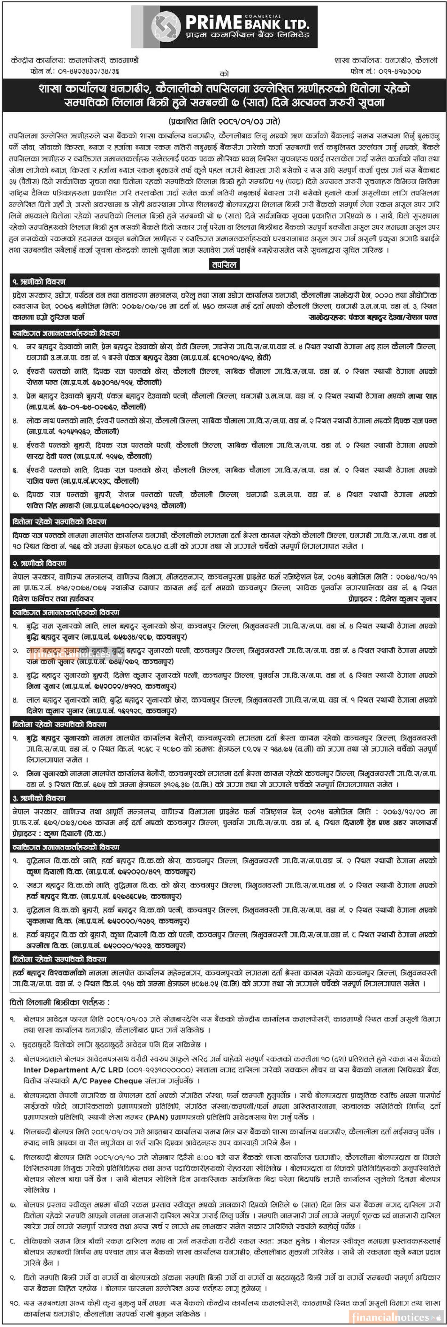 ऋणीको धितोमा रहेको सम्पत्तिको लिलाम बिक्री हुने सम्बन्धी ७ दिने सूचना