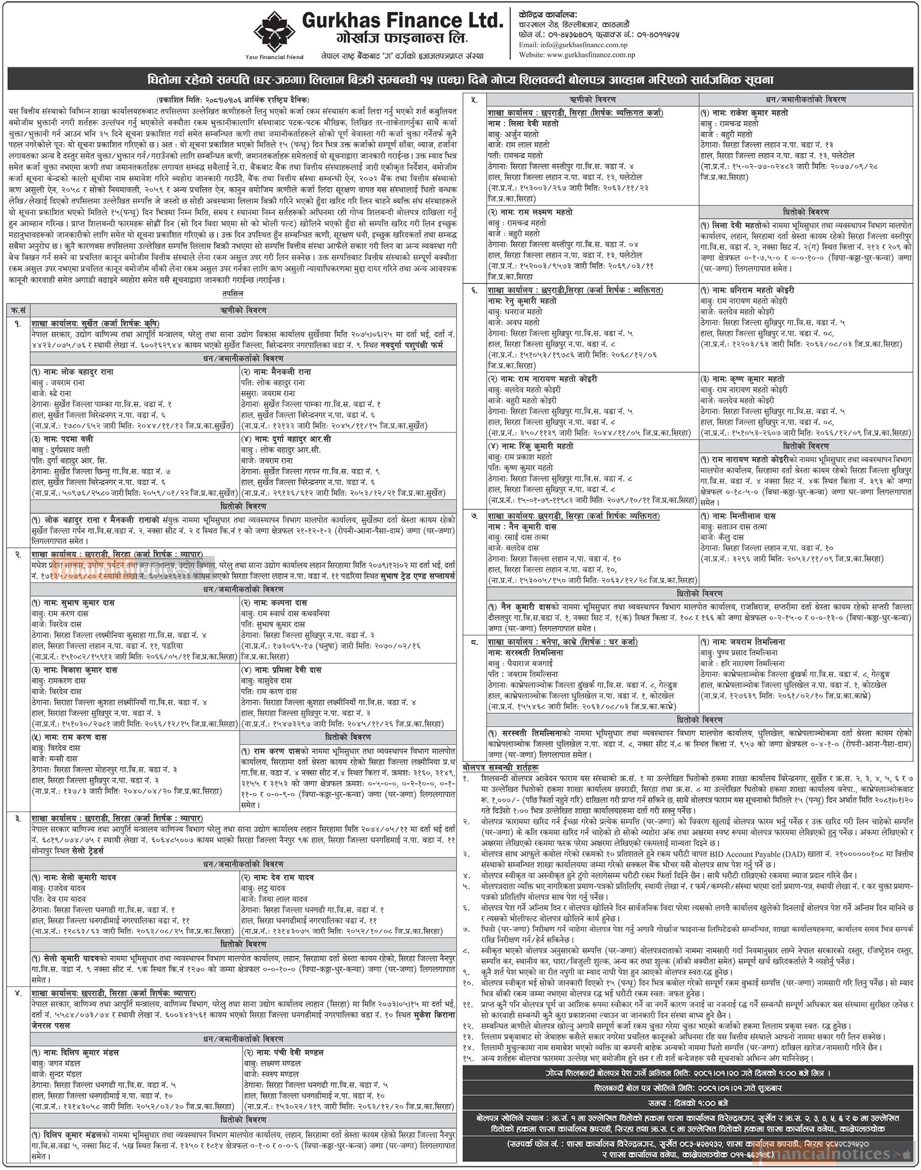 धितोमा रहेको सम्पत्ति लिलाम बिक्री सम्बन्धी १५ दिने गोप्य शिलबन्दी बोलपत्र आव्हानको सूचना