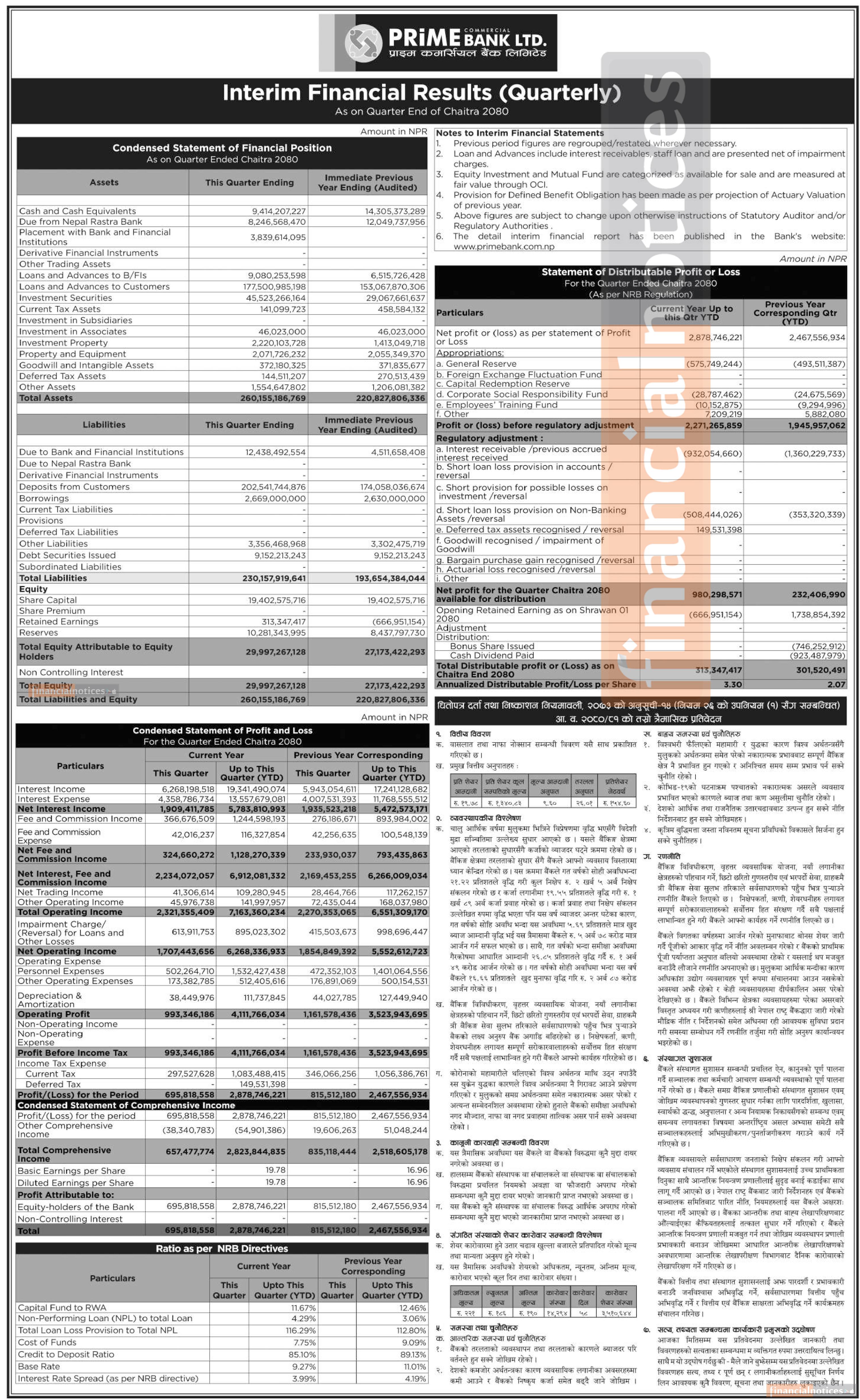 प्राइम बैंकको खुद नाफा २ अर्ब ८७ करोड ८७ लाख ४६ हजार रुपैयाँ - Q3 Report -
