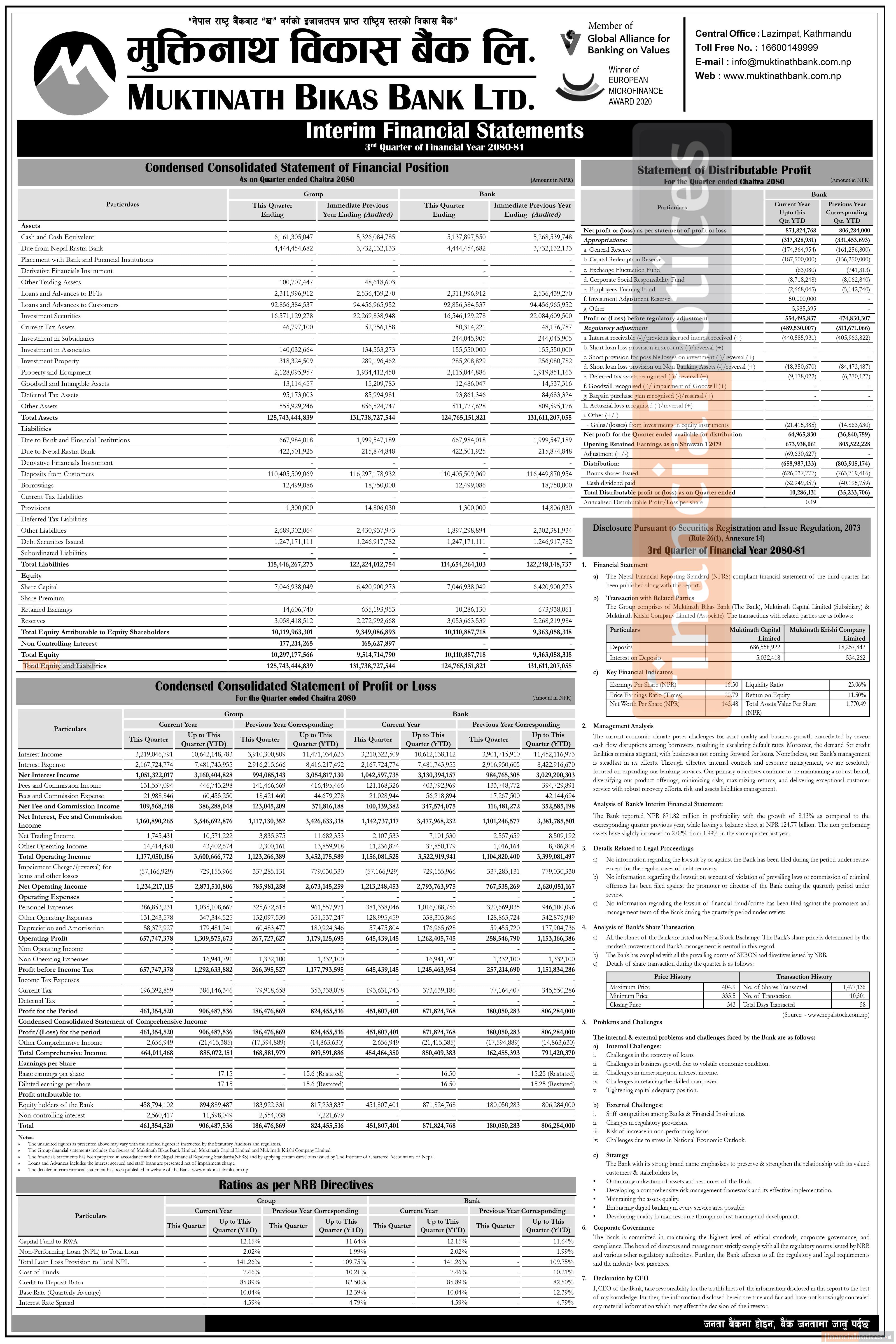 मुक्तिनाथ विकास बैंकको खुद नाफा ८७ करोड १८ लाख रुपैयाँ -Q3 Report -