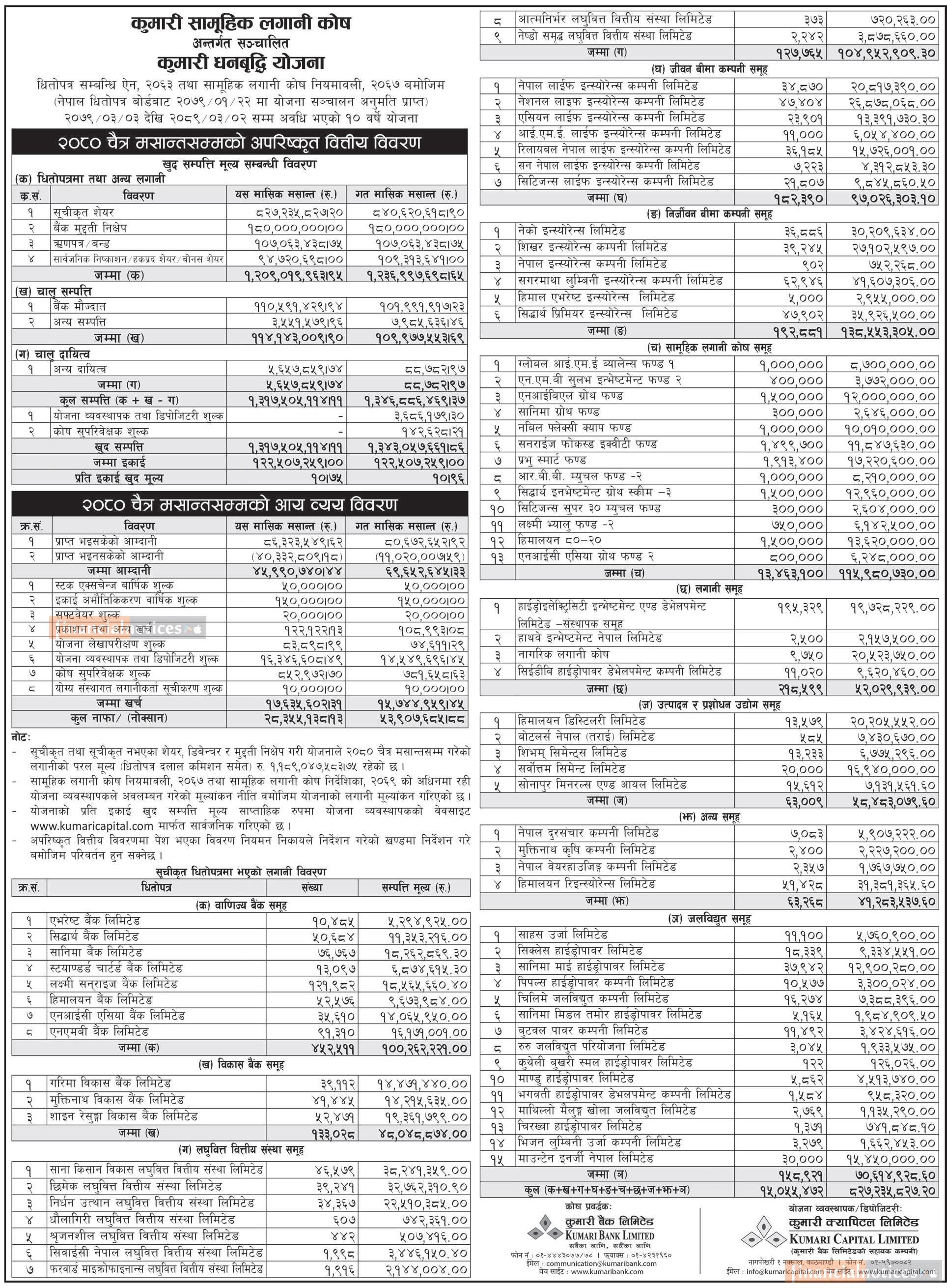 Kumari Capital has published Kumari Dhanabriddhi Yojana Net Asset Value till Chaitra, 2080